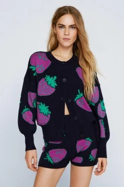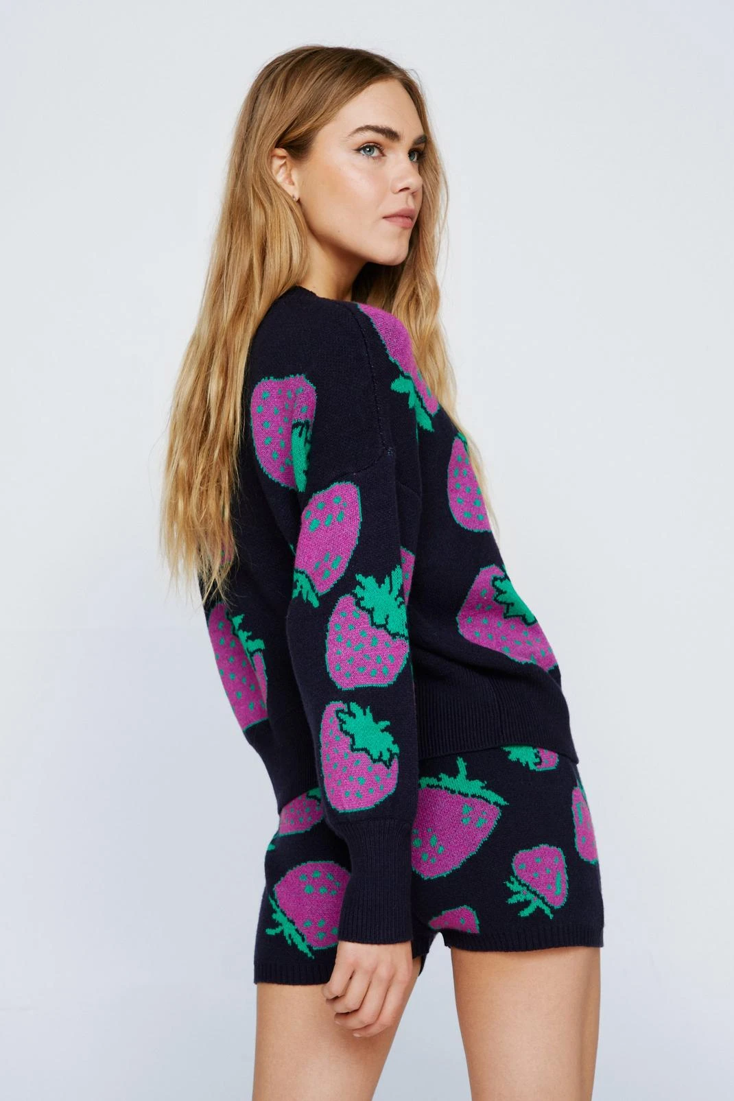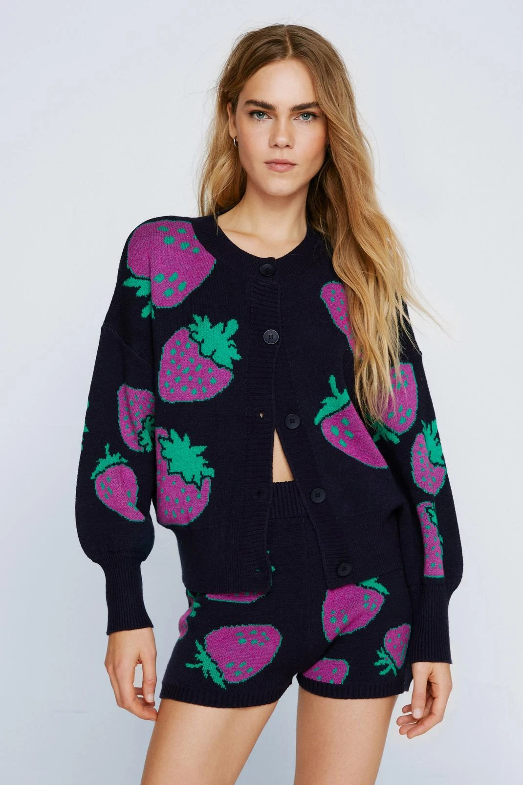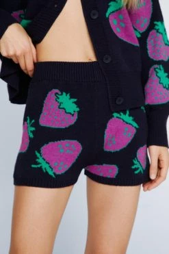 Feeling fruity. Our strawberry knitted shorts will have you feeling cozy, with their relaxed design and comfortable high waist. Style with the coordinating cardigan for a matching moment, perfect for chilled days at home.