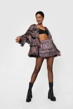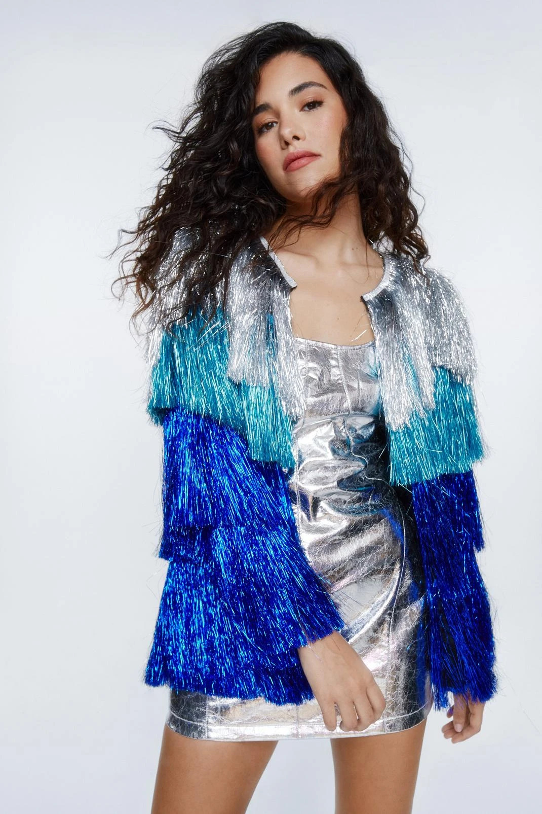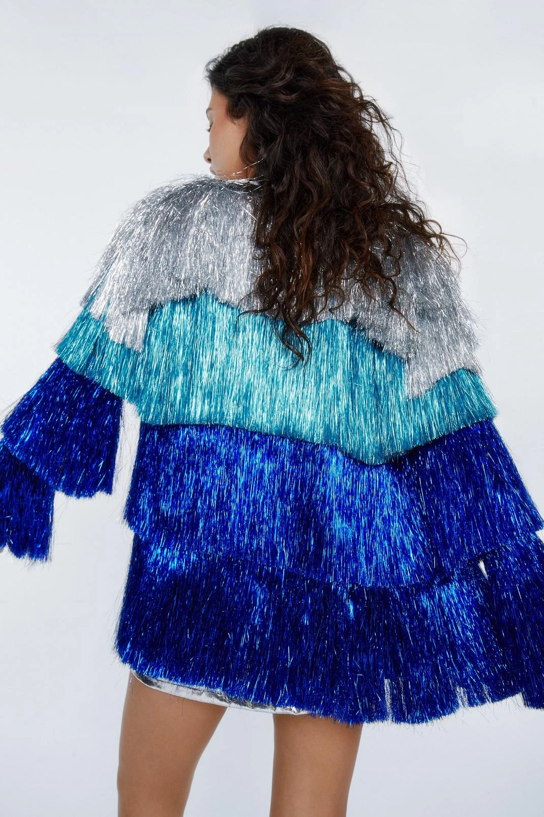 Party crasher… trust me, you can dance. This jacket features a relaxed silhouette, wide long sleeves, tiered design, multicolored metallic fringe, and open front. Model is 5’8′ and wears a US size 6/UK size 10.