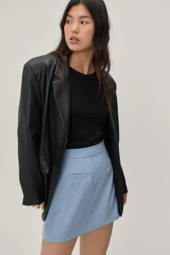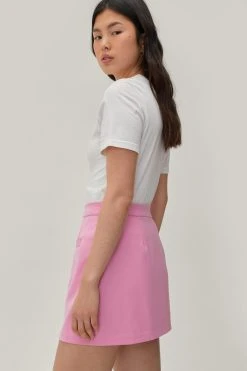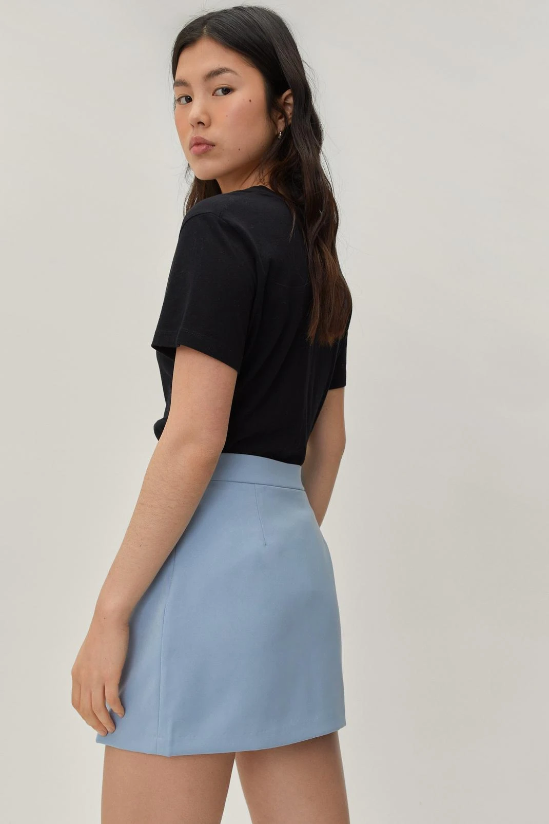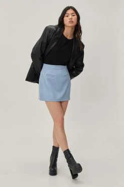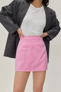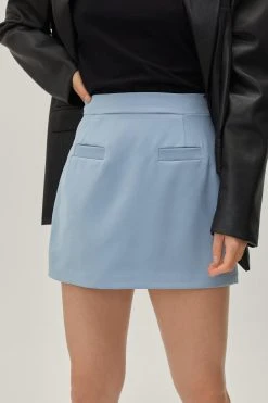 A moment for the mini. This skirt features a high waisted, micro mini silhouette, decorative pocket detailing at front, and zip closure at back. Let your legs out a little and style with a tailored shirt, ribbed ankle socks, and chunky loafers.