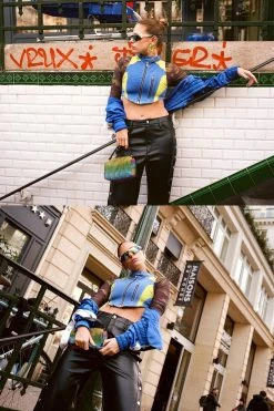Vroom vroom. Feel fierce in our corset top, in a motocross design, with a cropped length, zip front fastening, a high neckline, and a colorblock pattern. Style with jeans or leather pants for a look which will carry you seamlessly from happy hour to the nearest dancefloor.