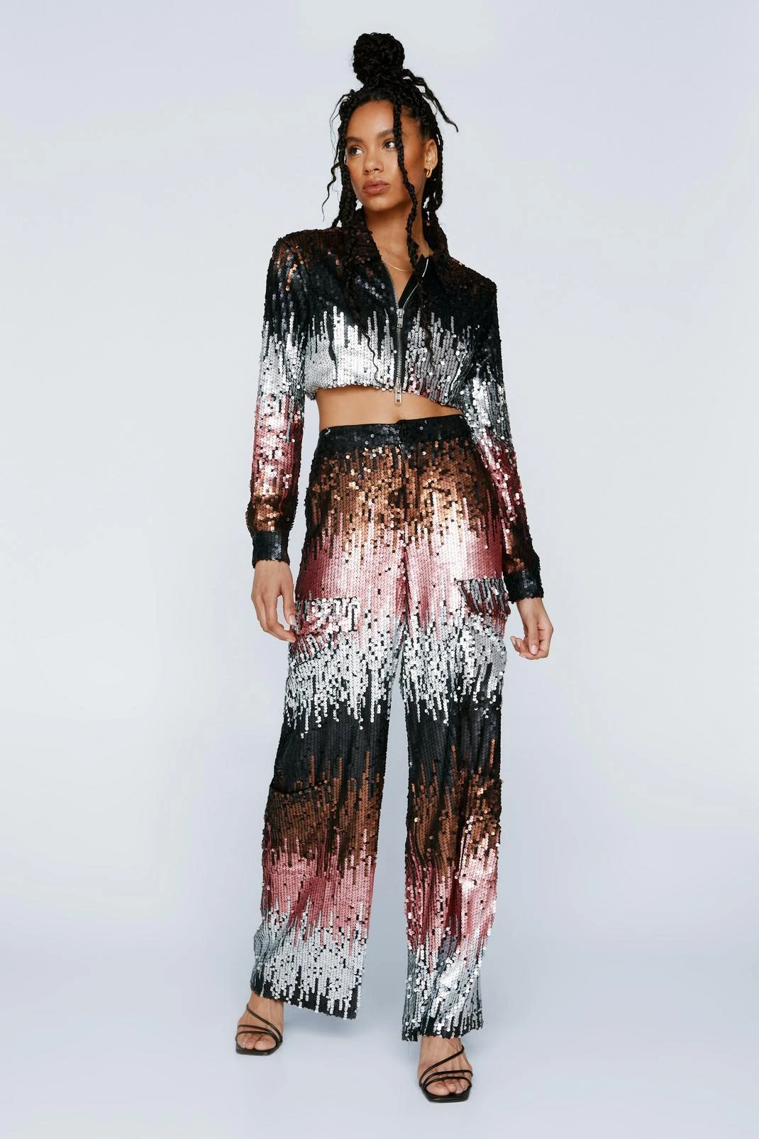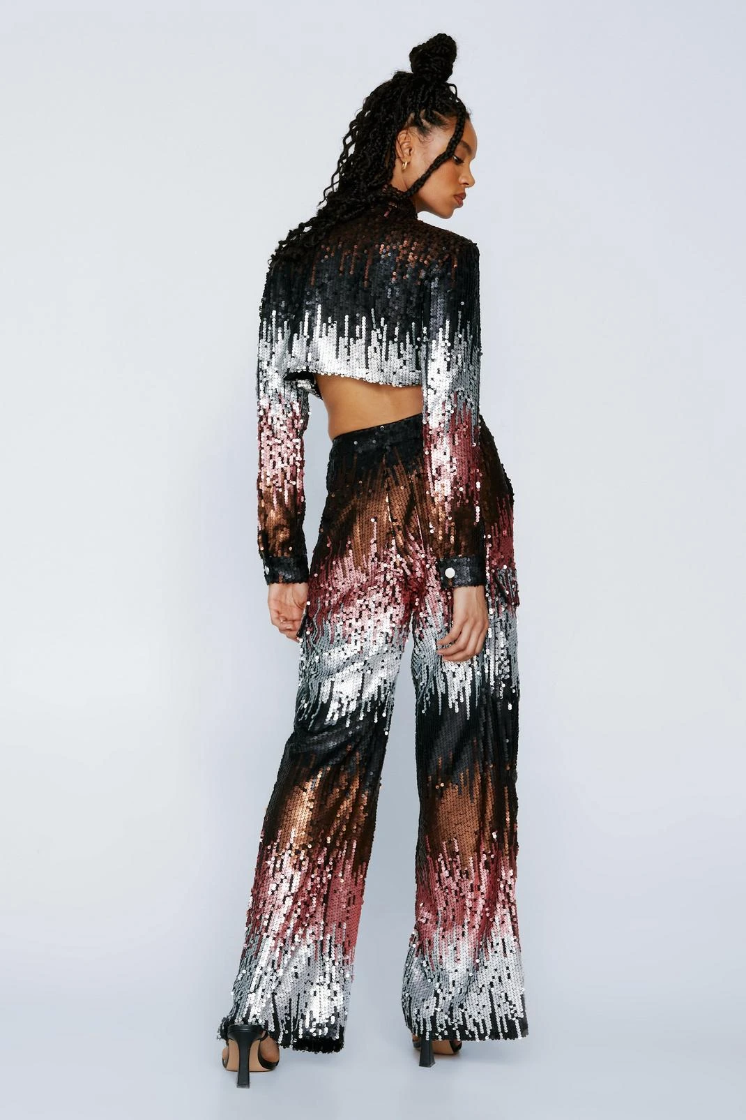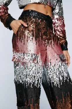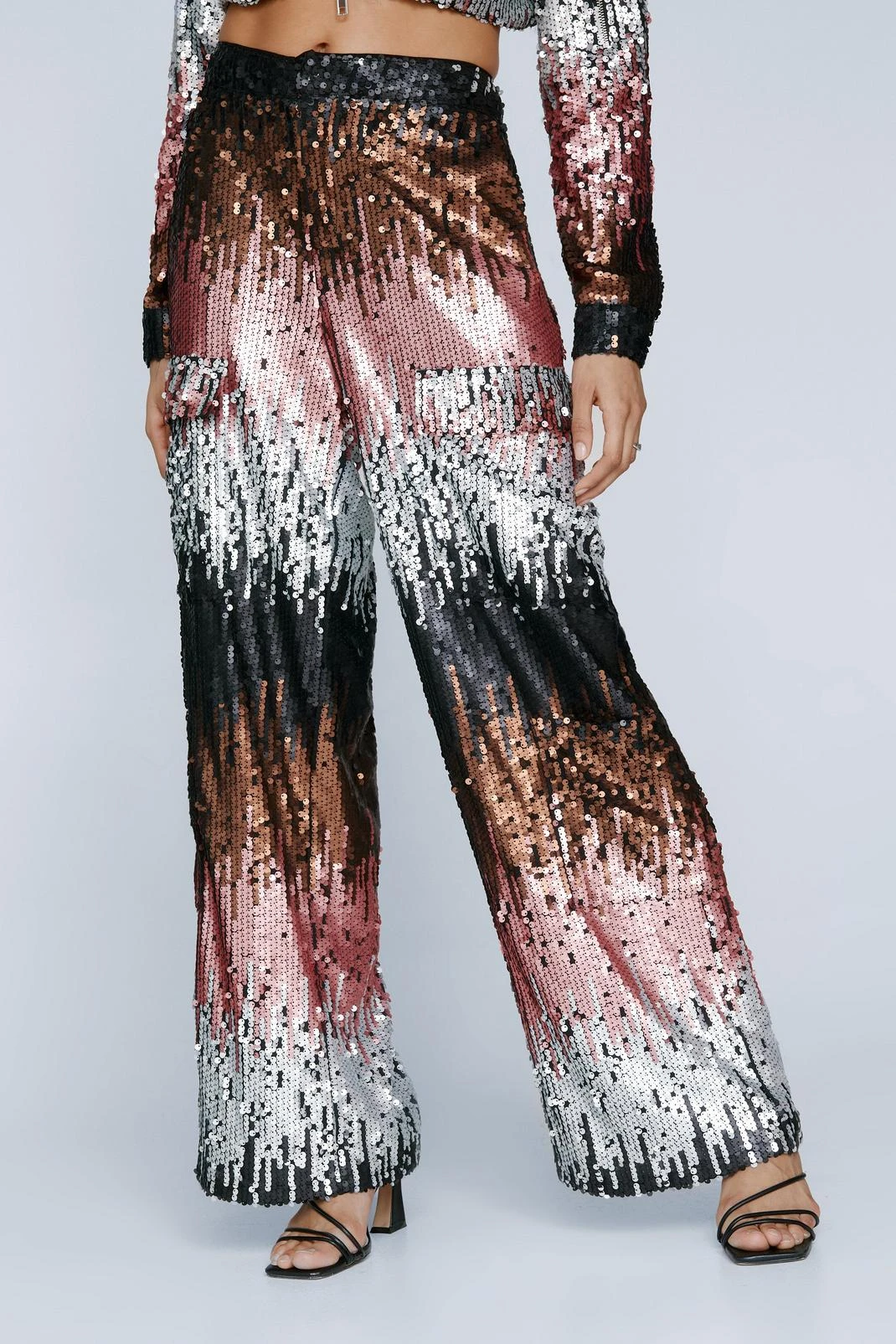 Add some sparkle. Feel confident in our cargo pants, made in high quality sequin fabric, with a flattering wide leg fit and pocket detailing. Pair the pants with the co-ordinating jacket for a matching moment, perfect for parties, occasions, and drinks with the girls.