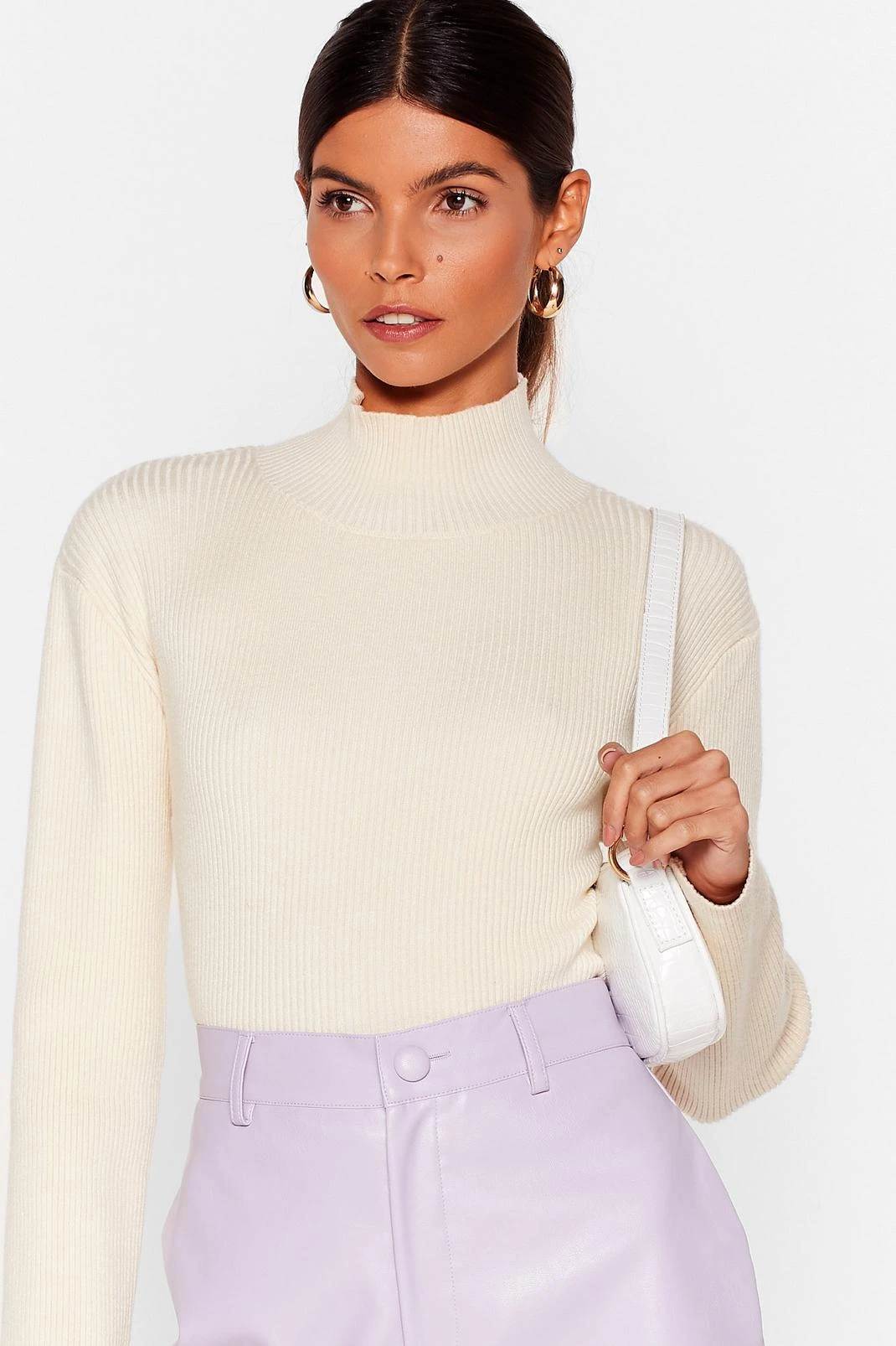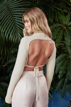 We knew you wouldn’t be away for long xoxo. This top comes in a ribbed knit and features a turtleneck, fitted, cropped silhouette, and open back with tie closure. Style with high waisted jeans and faux leather, stiletto mules. Model is 5’9″ and wears a US size 6/UK size 10.