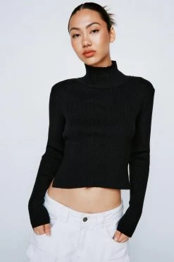 We knew you wouldn’t be away for long xoxo. This top comes in a ribbed knit and features a turtleneck, fitted, cropped silhouette, and open back with tie closure. Style with high waisted jeans and faux leather, stiletto mules. Model is 5’9″ and wears a US size 6/UK size 10.