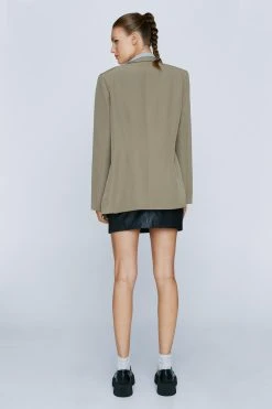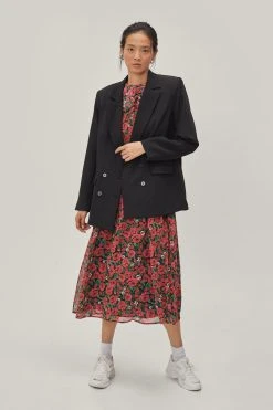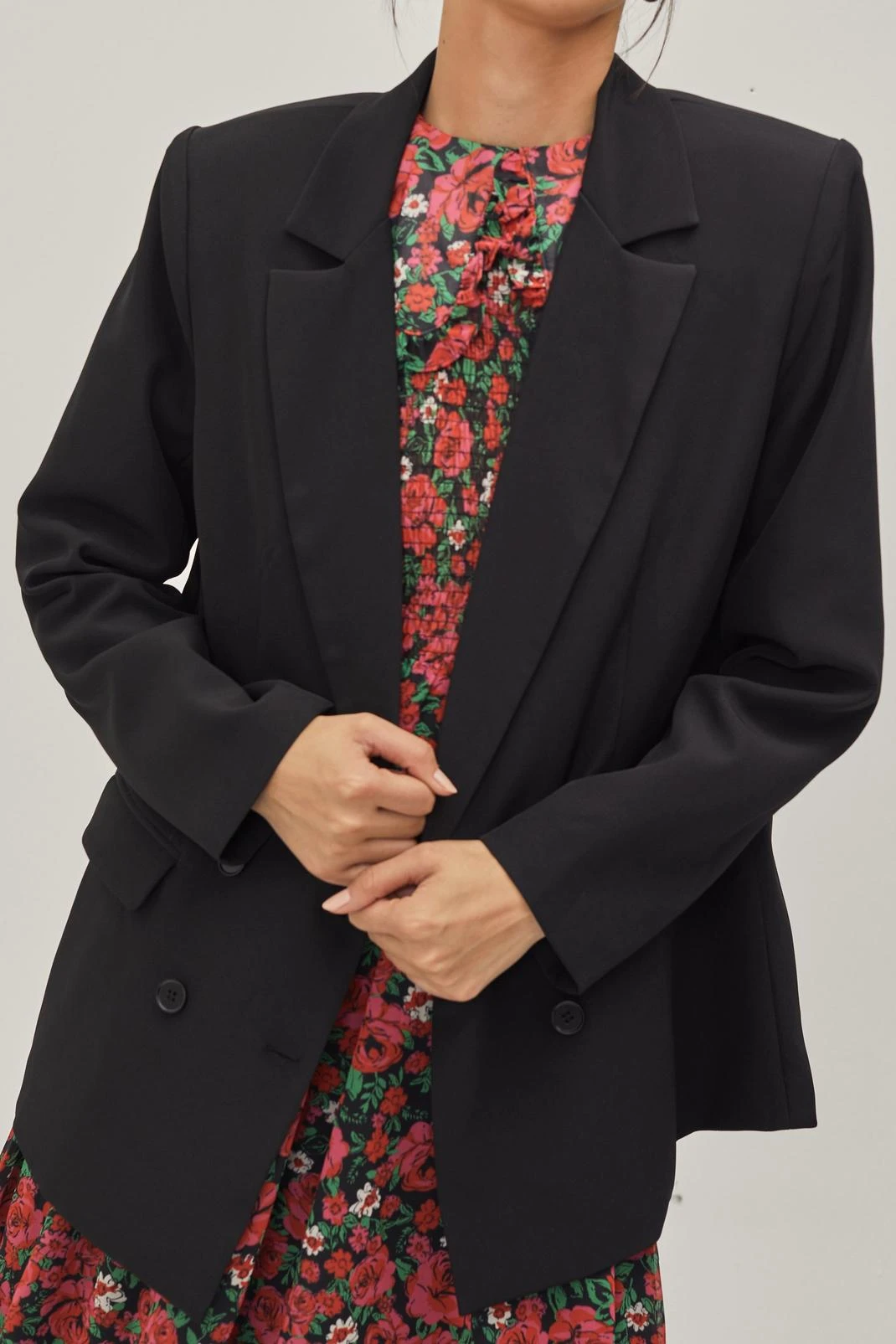 When business meets pleasure. This blazer features an oversized silhouette, padded shoulders, notched lapels, double breasted, button-down closures, and decorative flap pockets at front. Item sold separate.