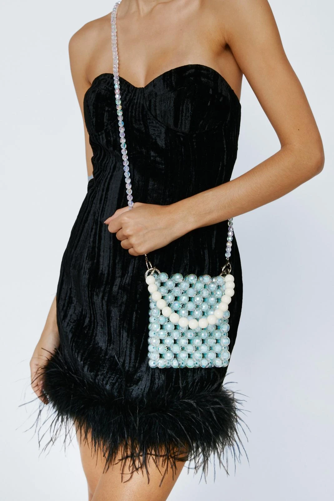 Bead it. Feel cute with our pearl beaded cross body bag, with a beaded material and shoulder strap design. Perfect for holding your essentials whether you’re going to a wedding, seeking out the nearest dancefloor, or hitting up happy hour. Pairs well with dresses and skirts, or can even be used to elevate an everyday look.