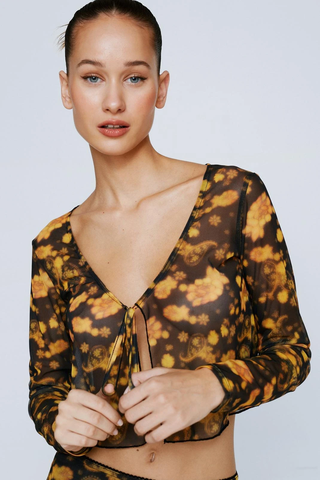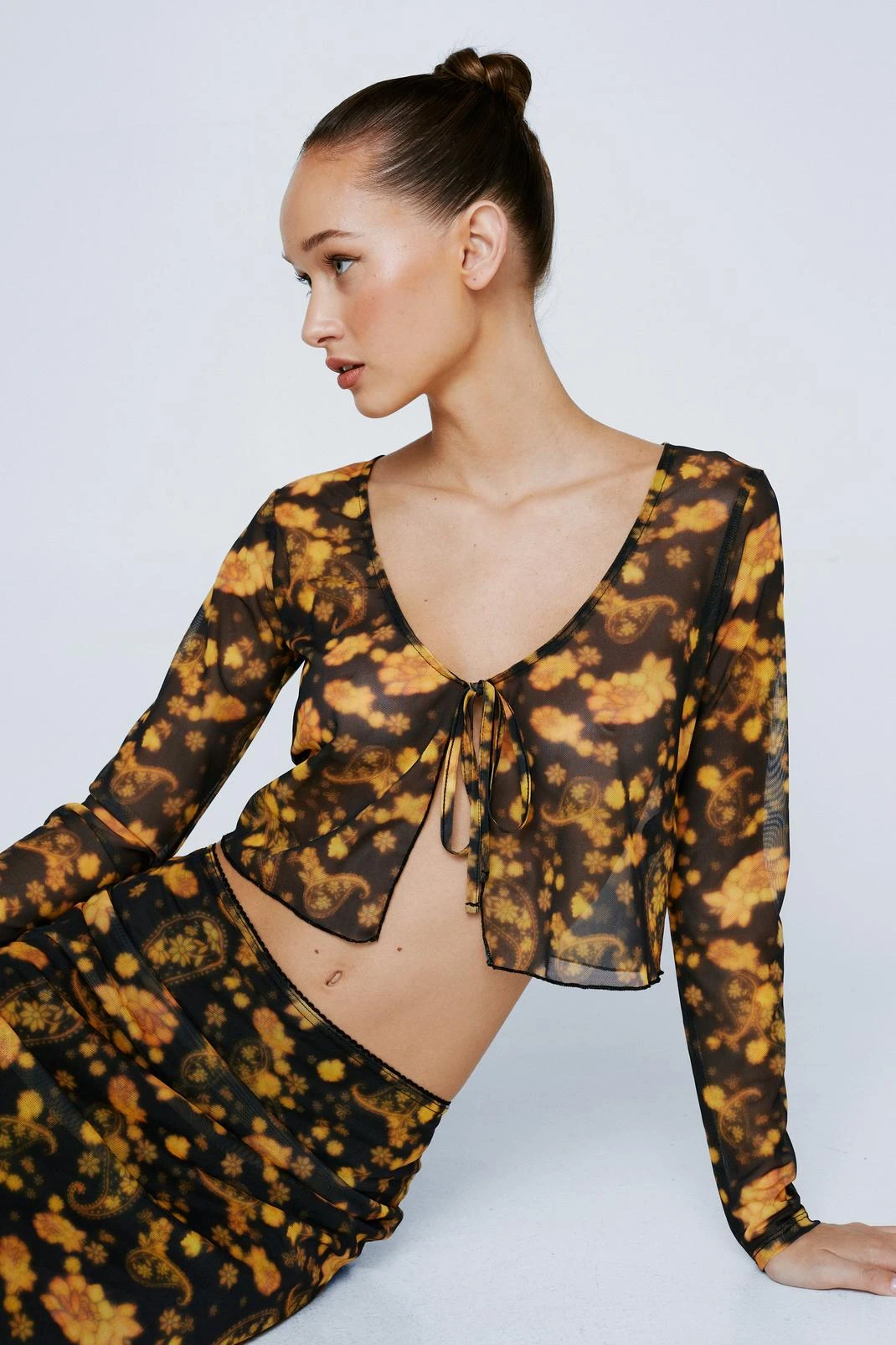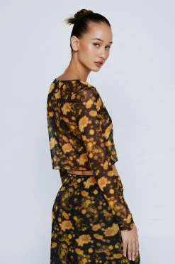 In bloom. Feel feminine in our tie front top, with a subtle floral print, a flattering relaxed fit, and a flirty open design. Pairs well with the matching maxi skirt for an interseasonal look that is perfect for going from dinner dates to happy hour.