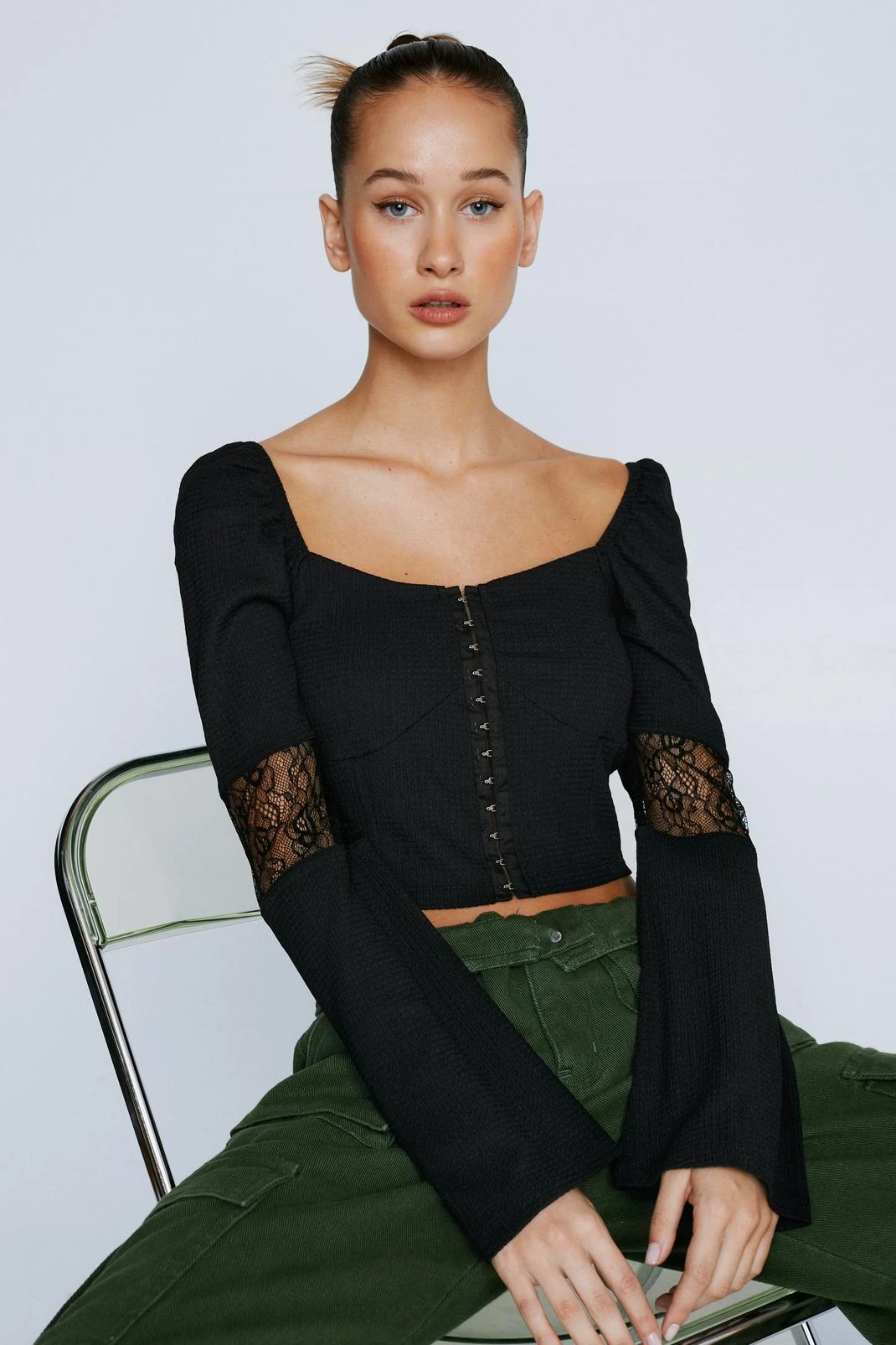 Cor-set it off. Feel fierce in our corset top, with statement hook and eye fastenings, sheer lace panelling, off shoulder sleeves, and a flattering square neckline. Pairs well with jeans and skirts for a look that will take seamlessly from day to night, from dinner dates to drinks to gig nights.