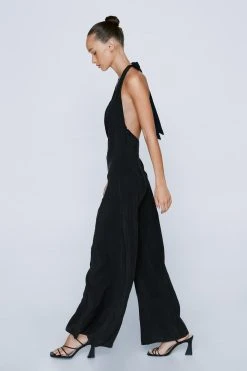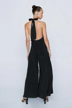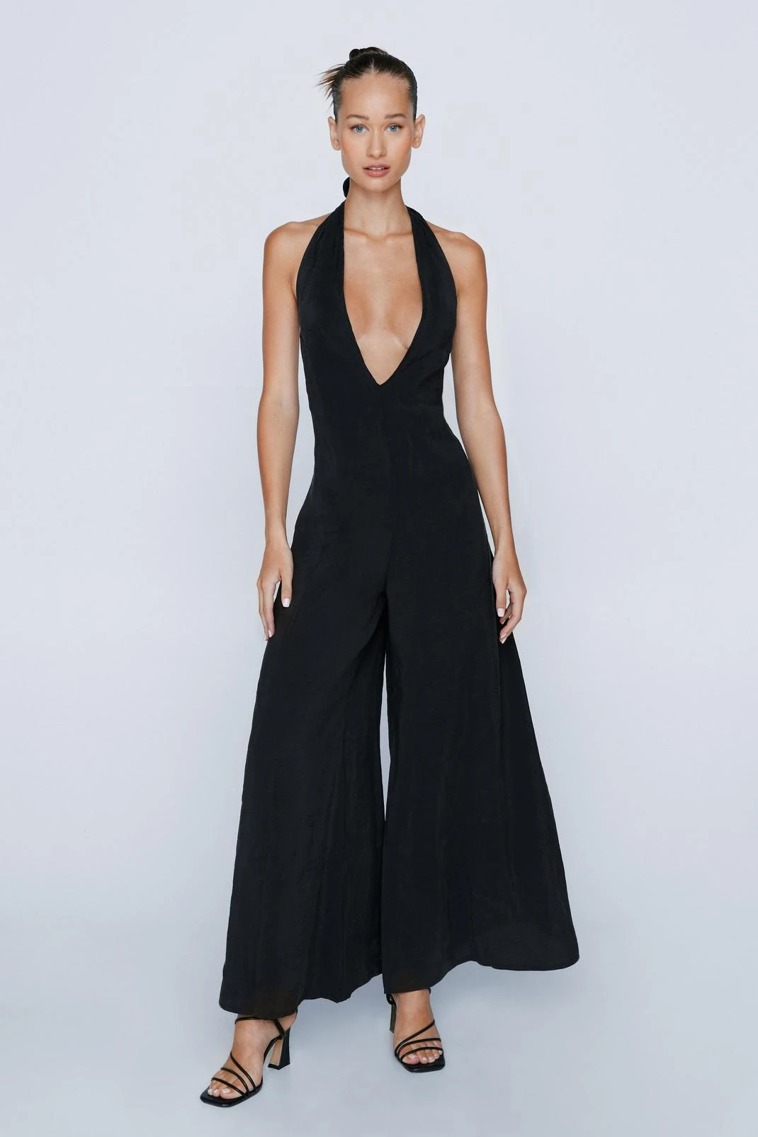 Turn heads. Feel like the centre of attention in our halter neck jumpsuit, with a statement backless design and a dramatic plunging neckline. Pairs well with strappy heels for a stellar occasion look, perfect for wedding guest days, and upcoming parties and occasions.