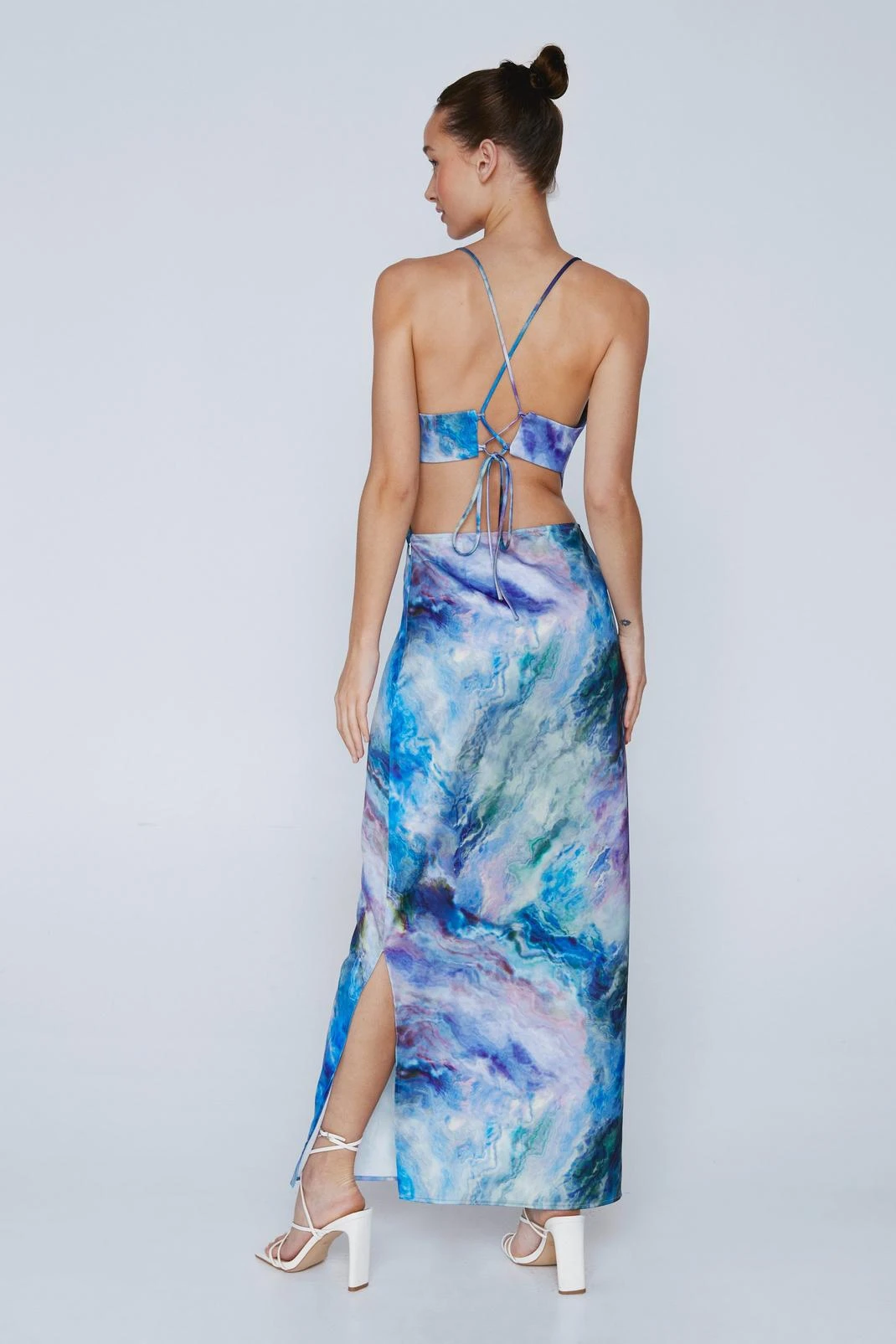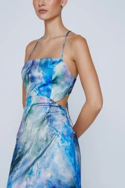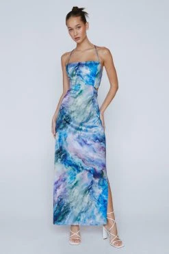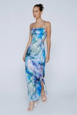 Find the nearest party. Feel glamorous in our maxi dress, with a statement strappy back with cut outs, a knee high leg split, and a uliversally flattering fit and flare silhouette. Pairs perfectly with strappy heels for a failsafe occasion look you’ll keep coming back to, whether it’s to wear as a wedding guest or as a showstopping vacation look.