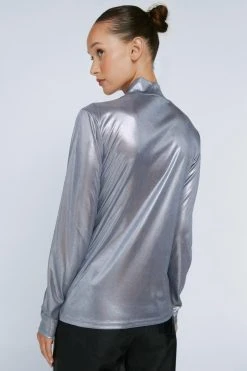 Glitter is always the answer. Feel fierce in our long sleeve top, made in high quality glitter fabric with a unique wetlook effect, and a comfortable funnel neck feature. Pair with leather pants and shorts for a look that will take you from festival weekends to party nights.