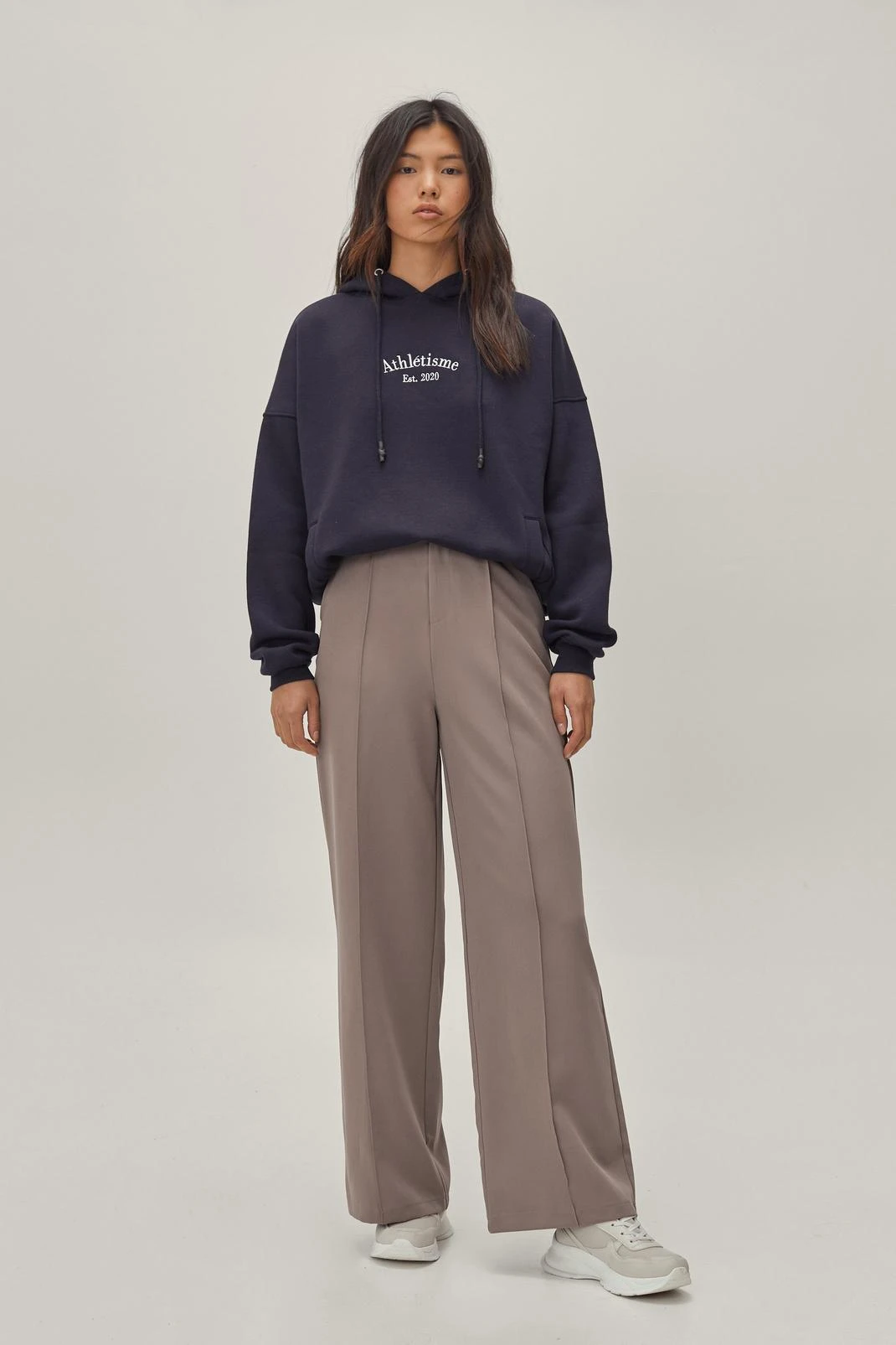 Power pants. These pants come in a soft woven fabric, making them both breathable and flexible. They feature a high waistband with snap closure, concealed zip-down fly closure, tailored silhouette, deep pockets at sides, and pintuck seam detailing throughout wide leg. For casual coffe runs wear yours with oversized silhouettes and chunky sneakers.