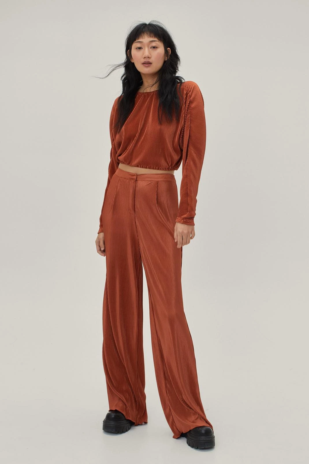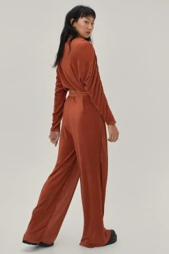 Pretty plisse? These pants come in soft plisse and feature a loose silhouette, high waistband with snap closure, concealed zip-down fly, full-length wide leg design, and pull-on style. For laidback festivities, we recommend teaming yours with the matching top and chunky leather-look boots.