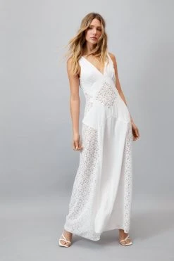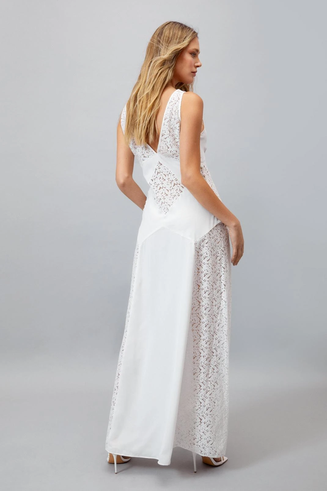 A moment for the dress. Feel formal in our jacquard maxi dress, with feminine and textured lace panelling and sheer details. The plunging V neckline is universally flattering and the low back offers a flirty peek. The flared skirt ensures that this dress is as glamorous as it is easy to wear. Style with strappy heels.