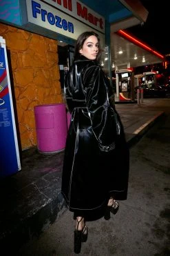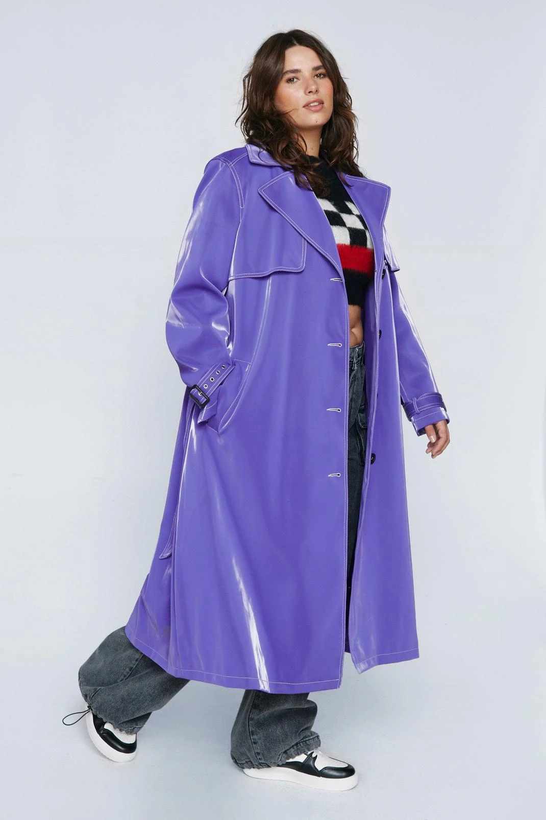 Come rain or shine. Brave the weather with our plus size high shine belted trench coat.