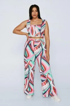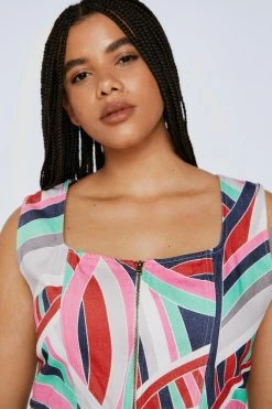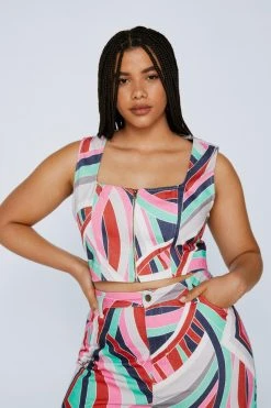 Add some color. Feel ready for anything in our zip up corset top, in a denim fabric and boasting a bright print. Style with the coordinating pants and sneakers for a look which will carry you seamlessly from mall afternoons to margarita evenings.