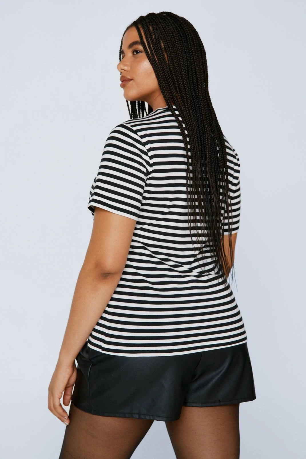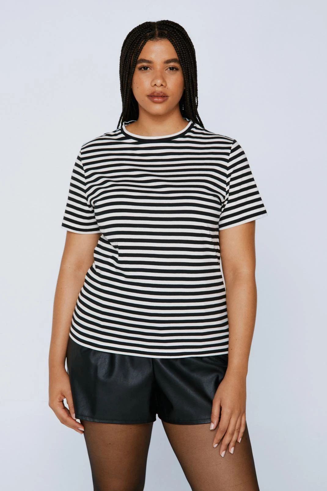Build your basics. Our plus size short sleeved stripe t-shirt looks great with leather shorts or pants.