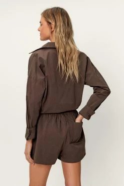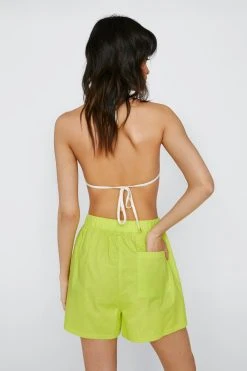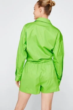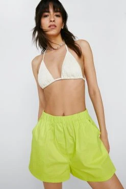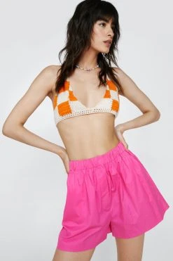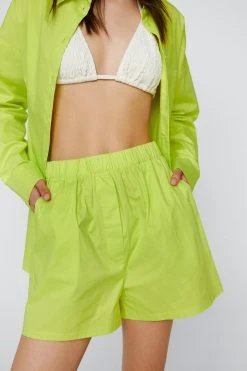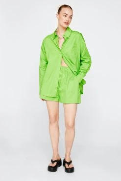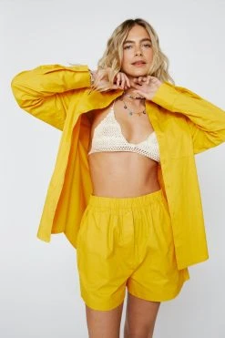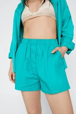 Here comes the sun. These shorts come in poplin – a fine, but thick fabric. This allows them to be breathable, making them perfect for when hot conditions strike. The shorts feature a relaxed silhouette, high elasticated waistband, and pull on design. We recommend wearing them together with the coordinating shirt and leather look ankle boots.