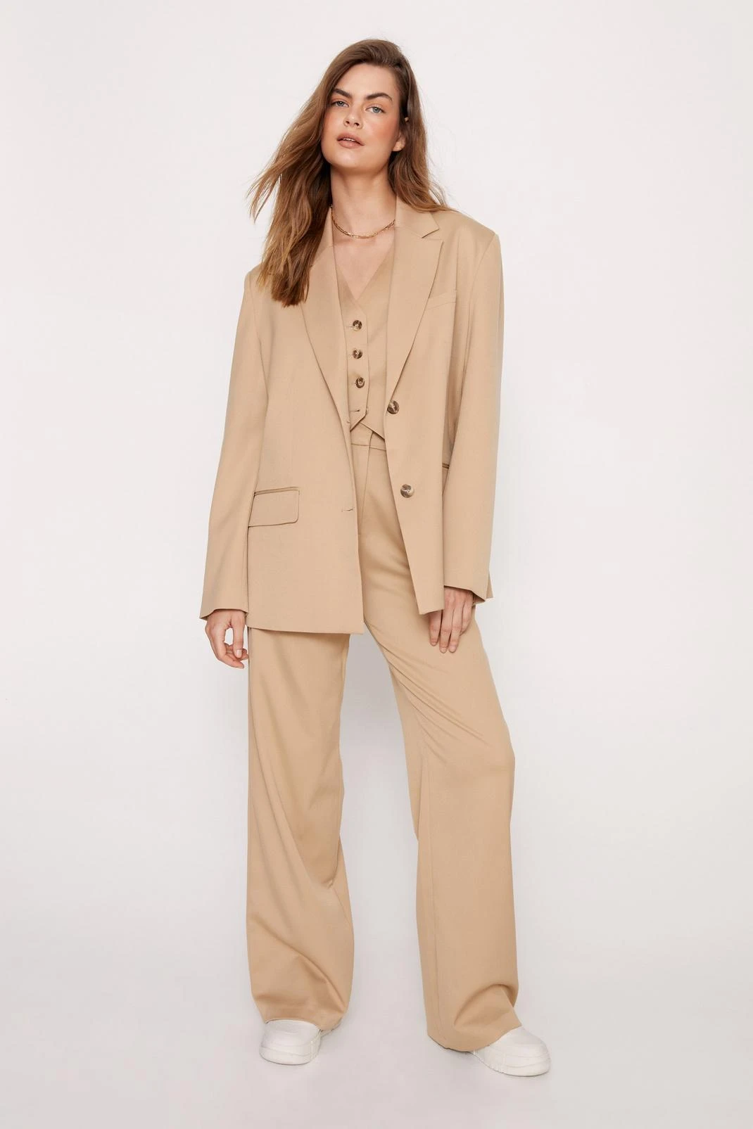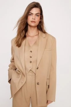 From boardroom to bar. Feel formal in our beige textured blazer, which can be worn from your meeting space to meeting the girls. Wear with the coordinating vest and pants for a matching moment.