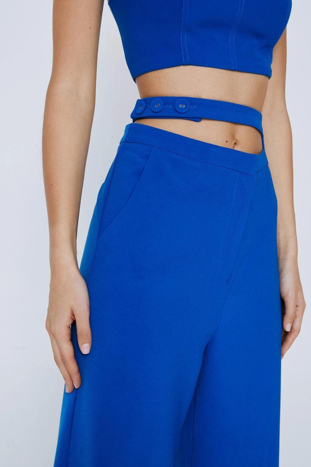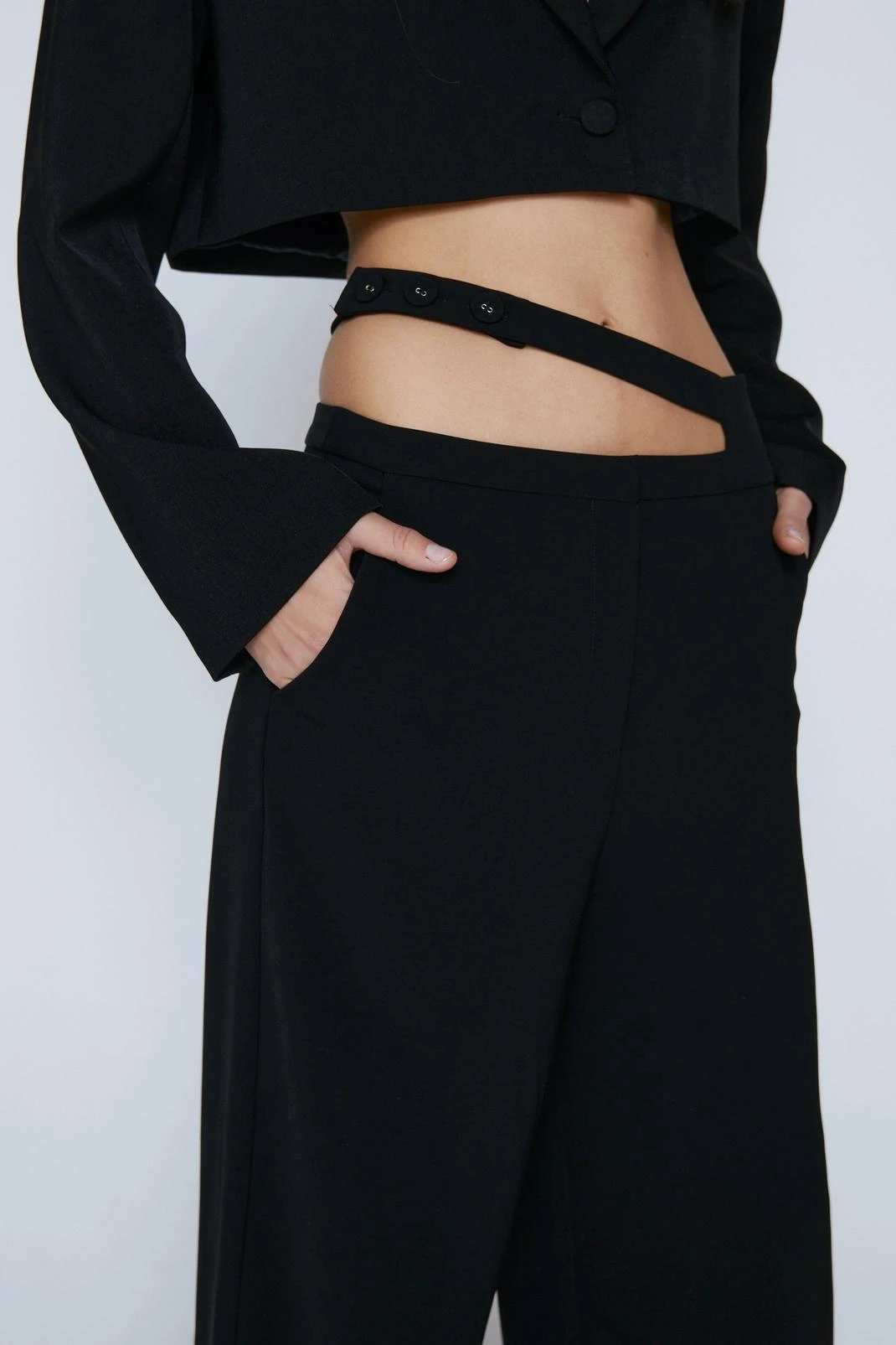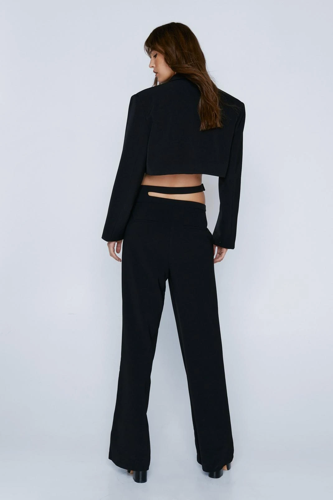 Down here. Feel luxe in our premium cut out tailored pants, perfect for party season and beyond. Style with a cropped blazer for an elevated look that will take you seamlessly from dinner to drinks.