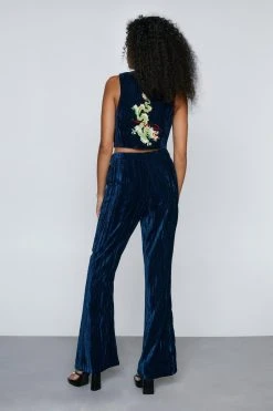 Add some flair. Our velvet flare pants with embroidered detailing are perfect for styling with the coordinating vest or blazer.