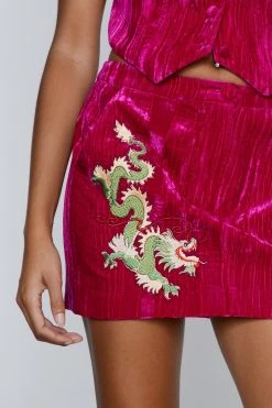 Smooth operator. Our premium velvet mini skirt with embroidered details can be styled perfectly with the coordinating vest or blazer for a matching moment.
