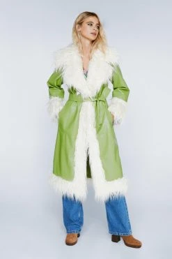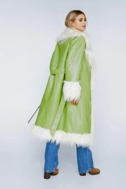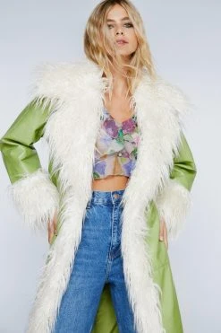 Draw attention. Our faux vinyl trench coat with fur trim is perfect for keeping you warm when it’s cold outside.