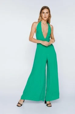 Turn heads. Feel like the centre of attention in our halter neck jumpsuit, with a statement backless design and a dramatic plunging neckline. Pairs well with strappy heels for a stellar occasion look, perfect for wedding guest days, and upcoming parties and occasions.