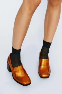Stand out. Style our leather heeled loafers with mini skirts and dresses to add some statement shine to any look.