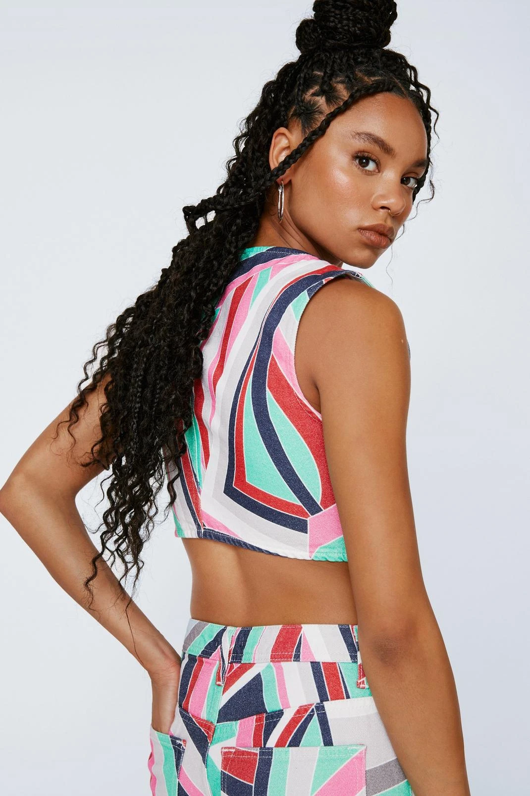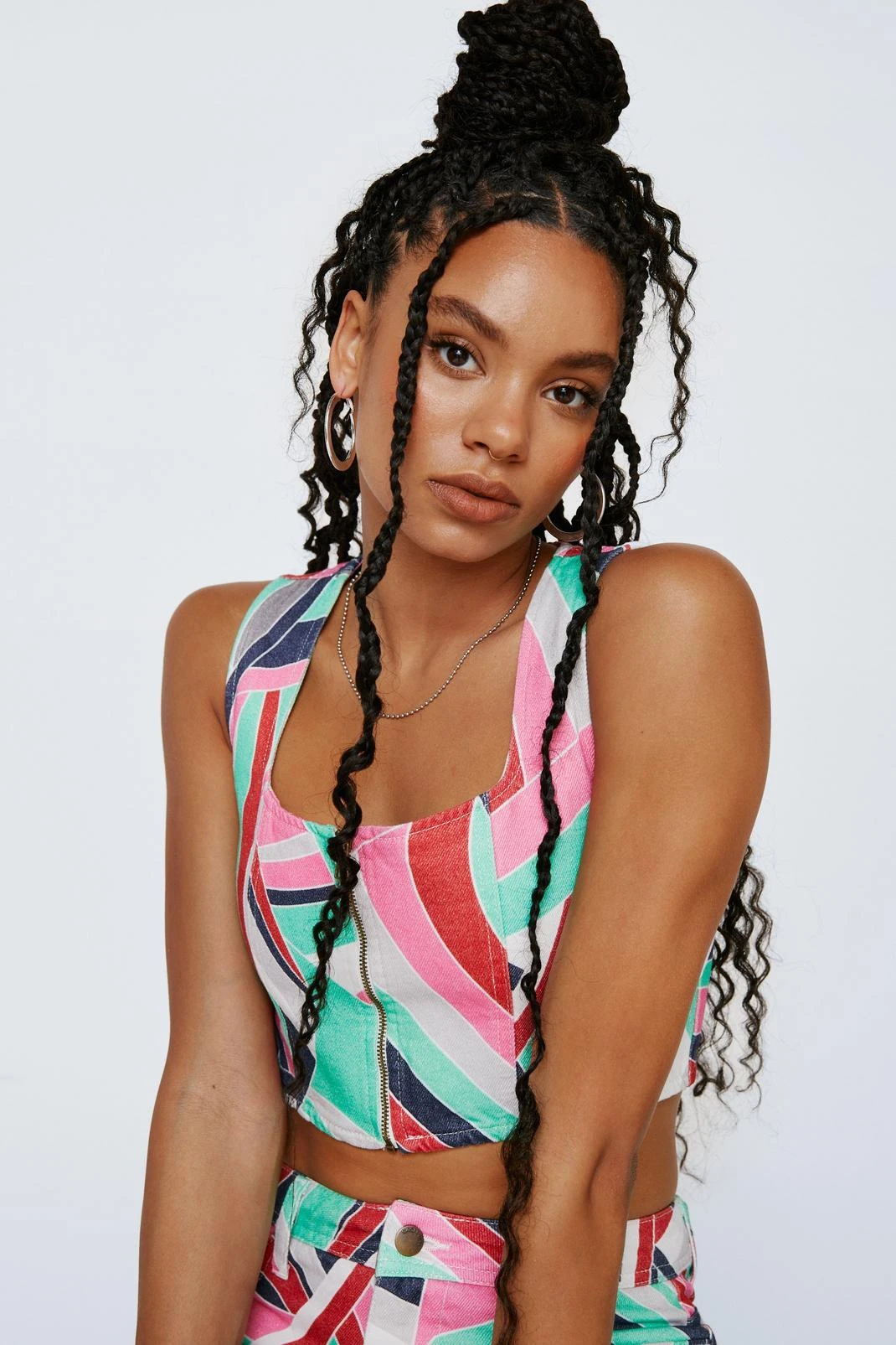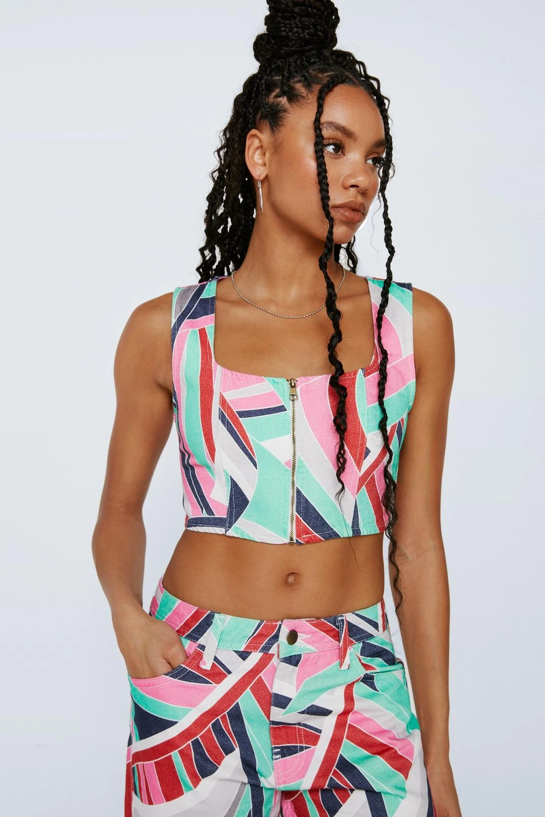 Add some color. Feel ready for anything in our zip up corset top, in a denim fabric and boasting a bright print. Style with the coordinating pants and sneakers for a look which will carry you seamlessly from mall afternoons to margarita evenings.