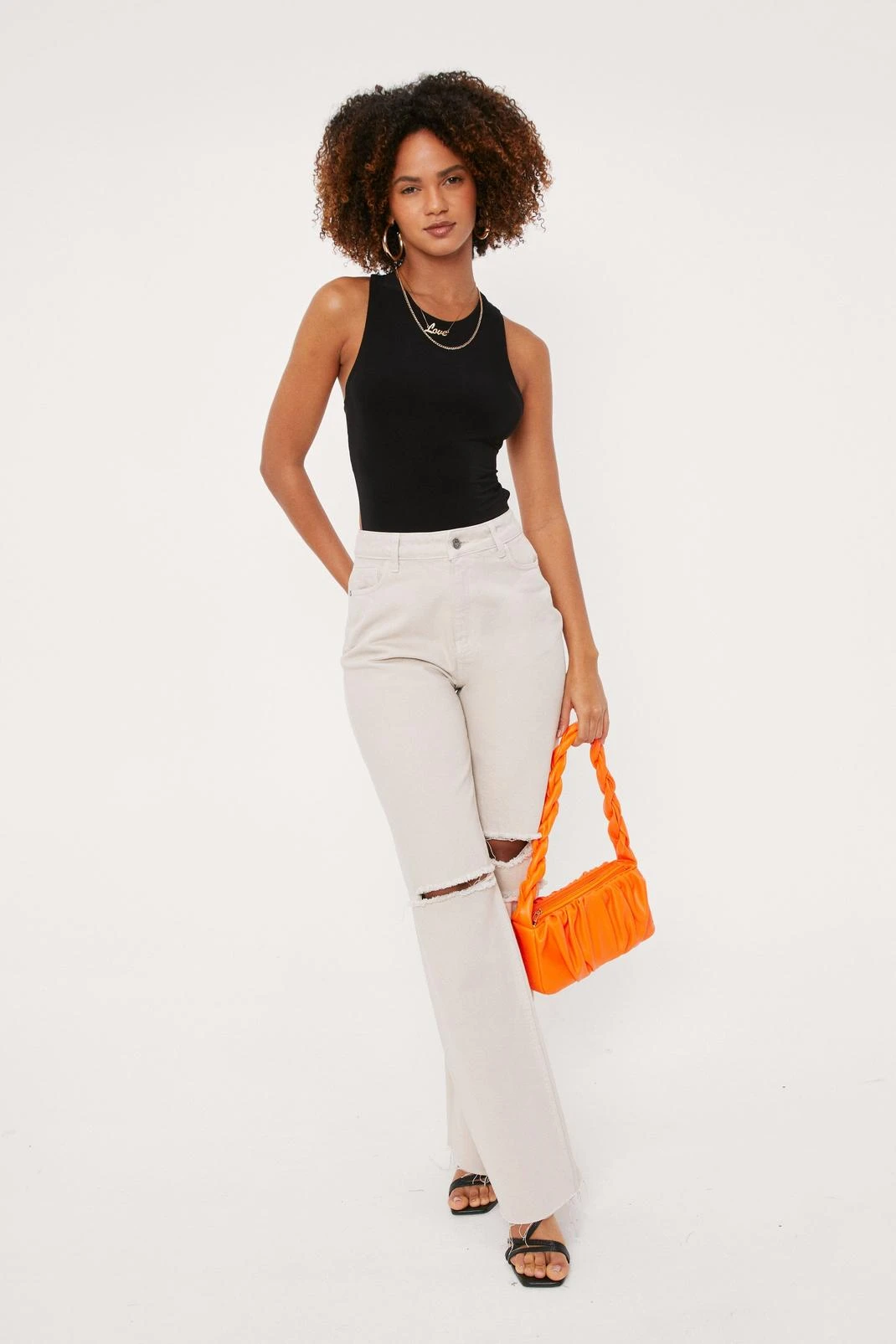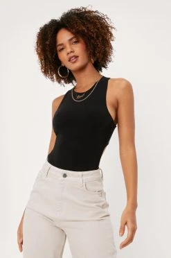 - Style: Racer Neck Cut Out Double Slinky Bodysuit