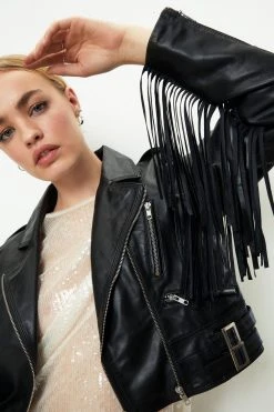 Subversive styling. Let your rebel heart shine in this real leather biker jacket. It features a cropped design, relaxed silhouette, pointed collared neckline, notched lapels, zip closure throughout front, long sleeves with fringe detailing, and fringing at yolk. Use yours to toughen up your sequin shift dresses, mini satin numbers, and little black dresses.