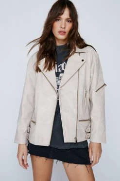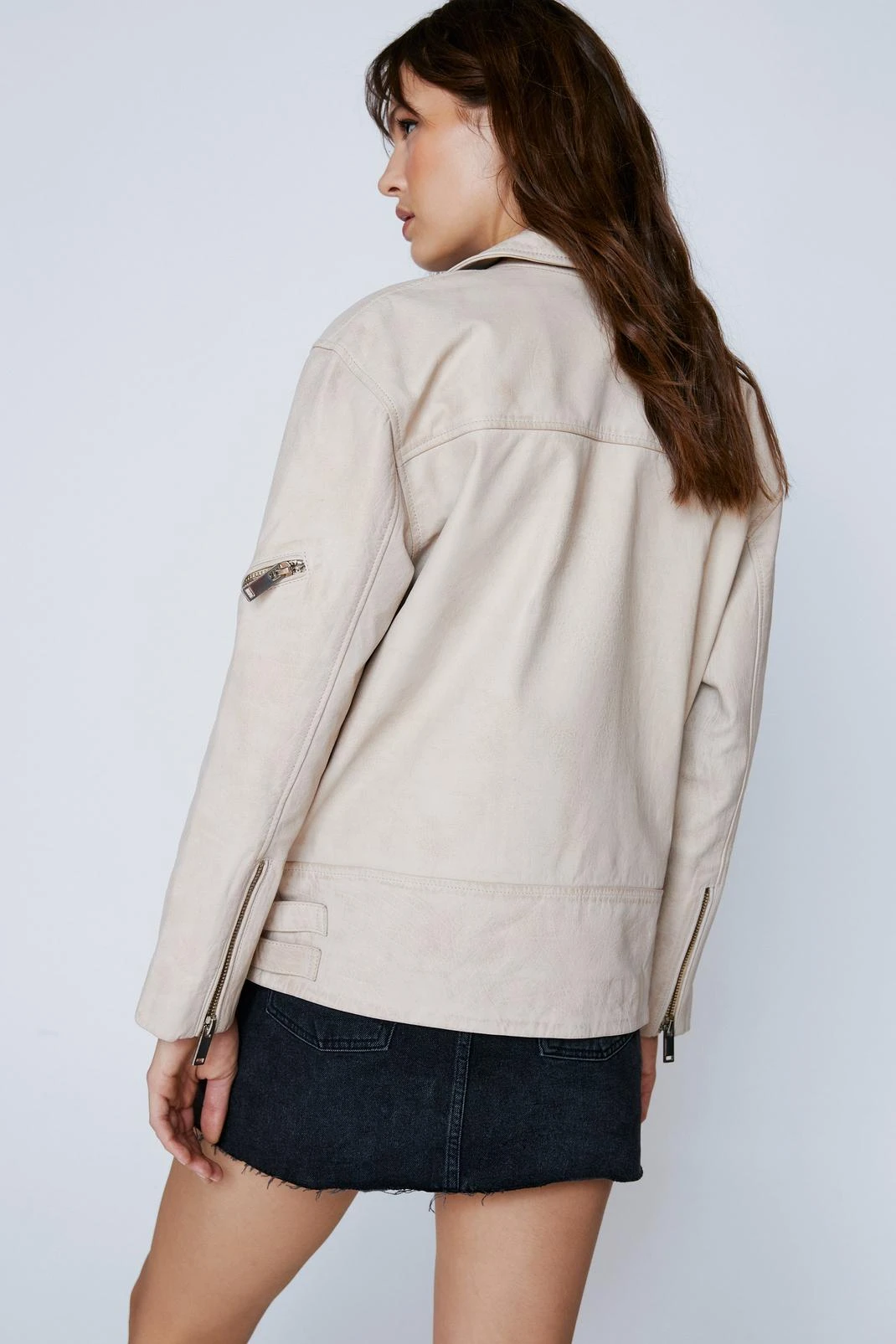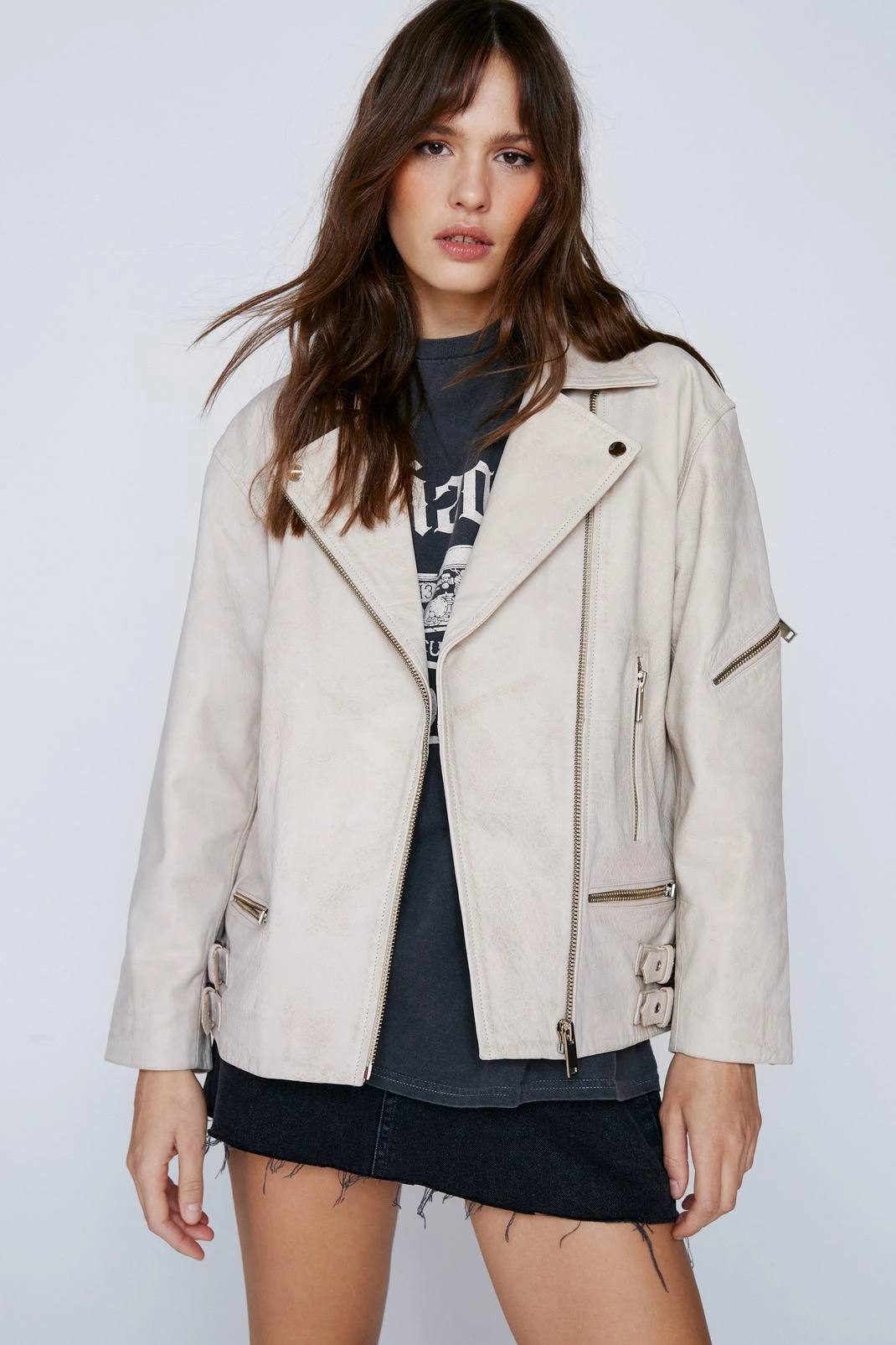 Add a layer. Feel fired up in our real leather jacket, in an oversized style with zip pocket detailing and buckle accents. Pairs well with denim and dressed up days out.