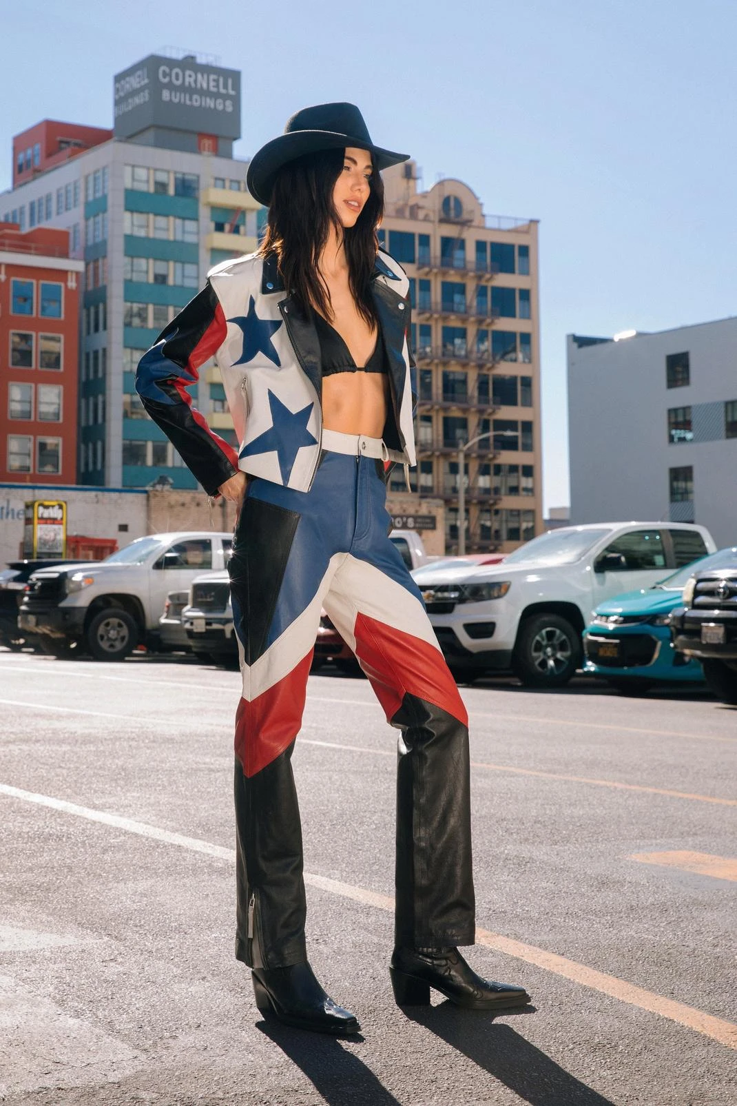 Layer up. Feel edgy in our leather pants, with fun star detailing, colorblock design, and a comfortable straight fit. Pairs well with the matching leather jacket and boots for an elevated day look.
