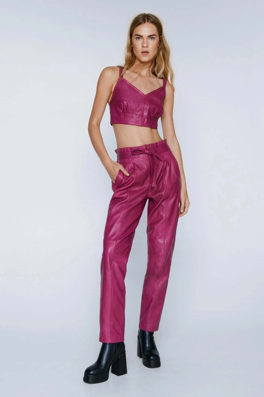 - Pink to make the boys wink. Real leather trousers with tie waist detail.