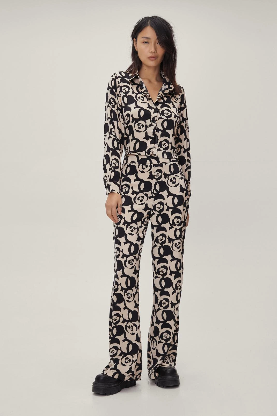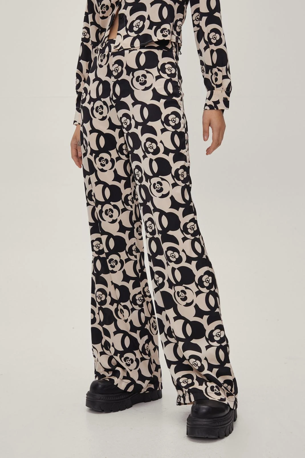 Hey soul sister. These pants come in satin and feature a high waisted, flared silhouette, zip fly closure, and abstract floral print throughout. Style up with the matching cropped blouse and chunky biker boots.