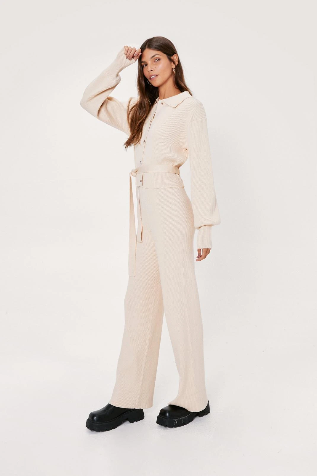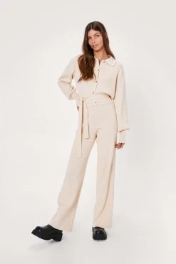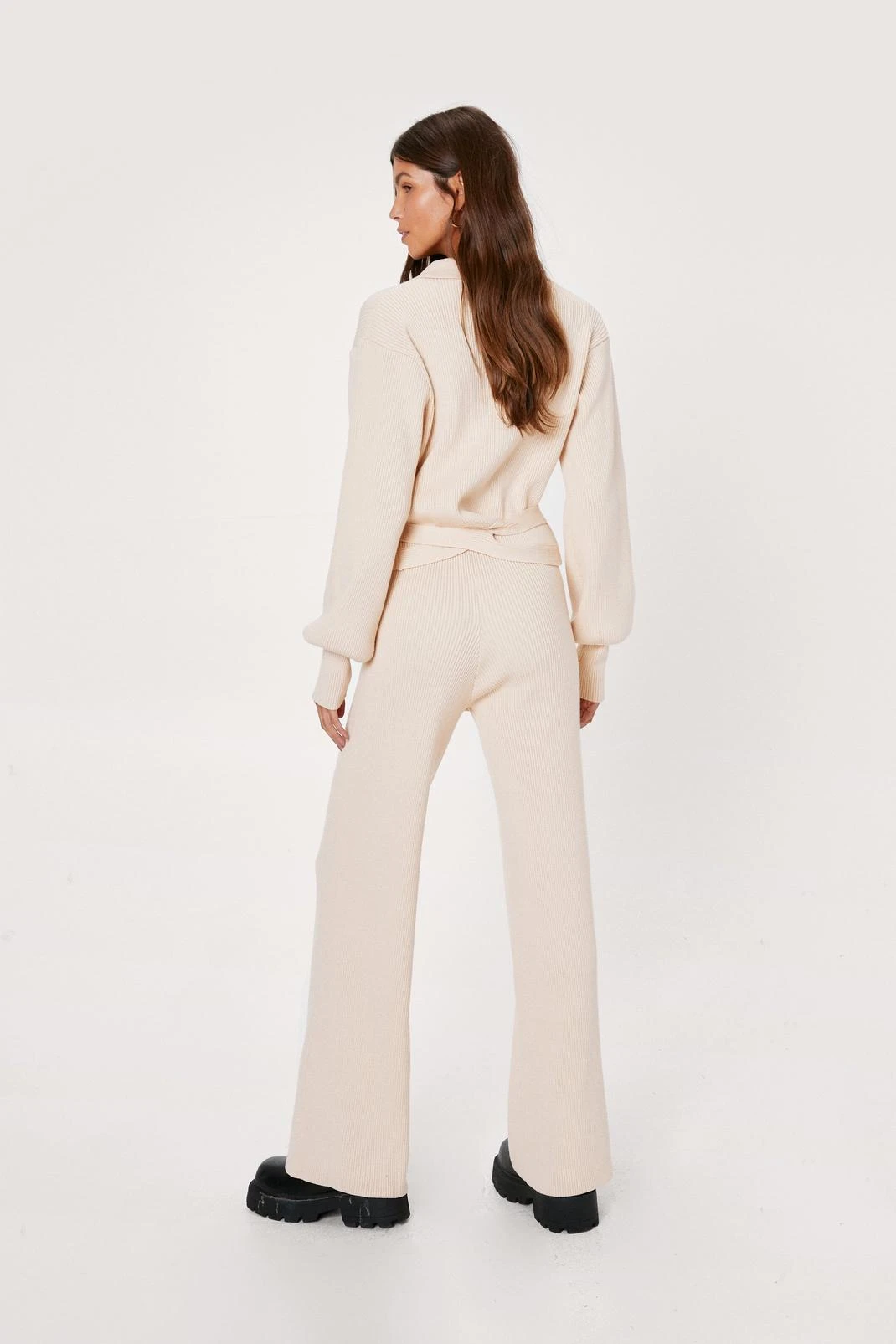 Just the two of us. This set comes in soft ribbed knit and consist of a cardigan and wide leg pants. The cardigan features a relaxed silhouette, pointed collared neckline, button-down closures, long balloon sleeves, fitted cuffs, ribbed edges, and belt at waist with bow tie closure. The coordinating pants feature an elasticated high waistband, relaxed silhouette, full-length wide leg style, and pull-on design.