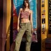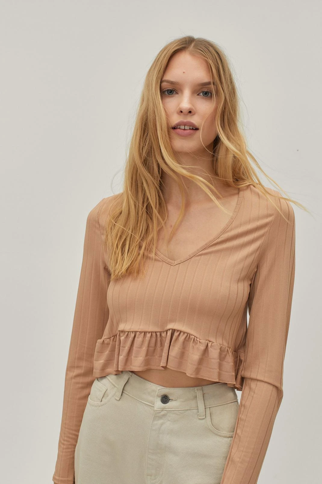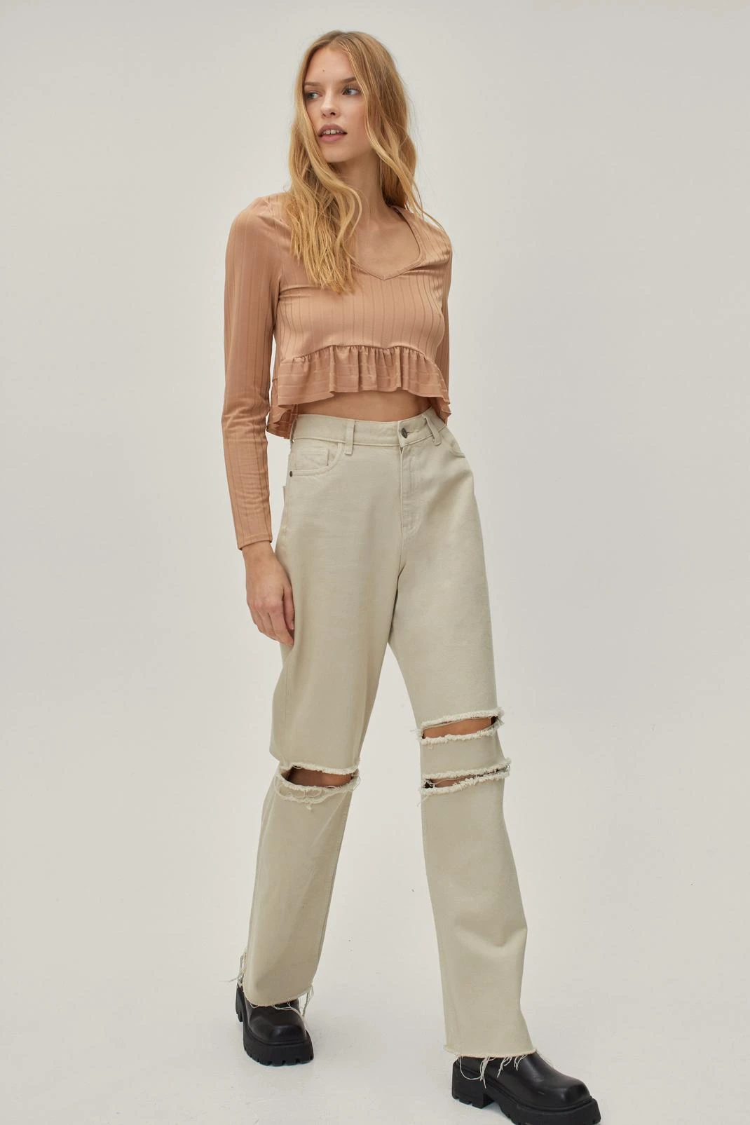 Ruffle and ready. This crop top comes in soft, breathable fabric and features a comfortable relaxed silhouette, a cropped cut that falls just above the waist, long sleeves, a wide scoop neckline that shows off your décolletage, and ruffle hem detail. Pair with wide leg jeans and heeled boots.
