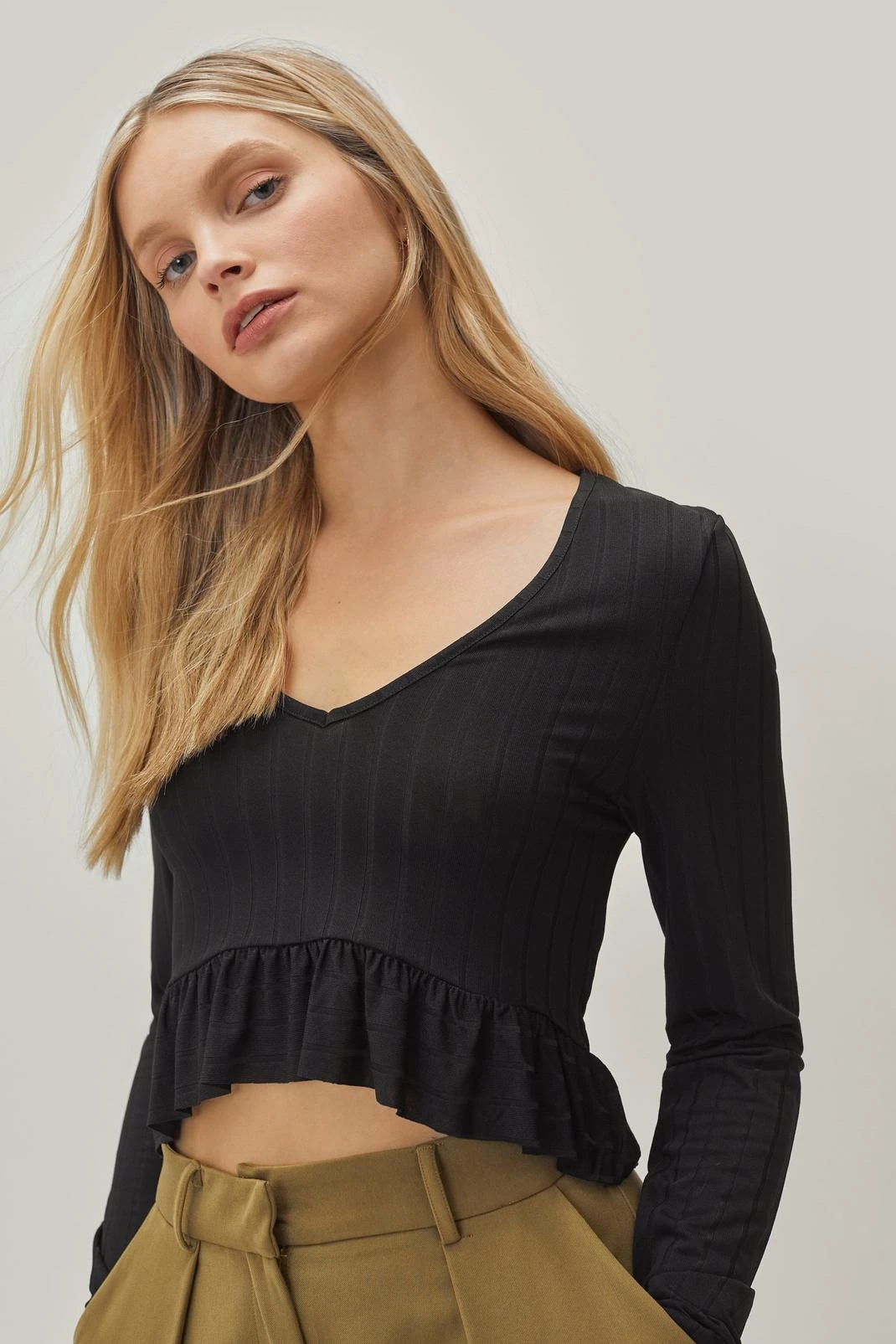 Ruffle and ready. This crop top comes in soft, breathable fabric and features a comfortable relaxed silhouette, a cropped cut that falls just above the waist, long sleeves, a wide scoop neckline that shows off your décolletage, and ruffle hem detail. Pair with wide leg jeans and heeled boots.