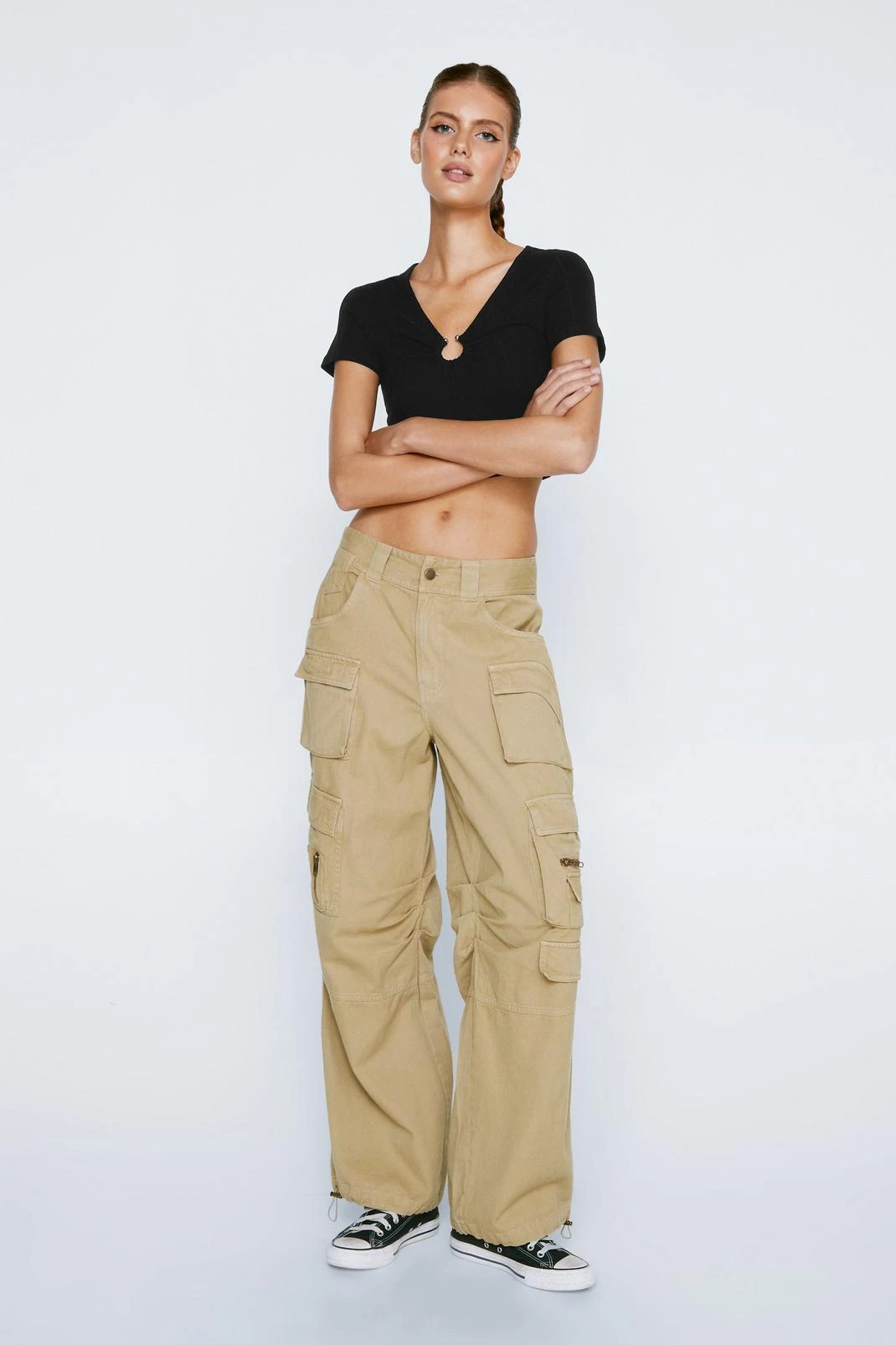 Top it off. Feel cute in our short sleeve top, with a unique ring accent in the front, as well as a deep V neckline, a flirty cropped length, and a casual short sleeve design. Pairs well with jeans, cargo pants, and mini skirts for an instant day to night look.