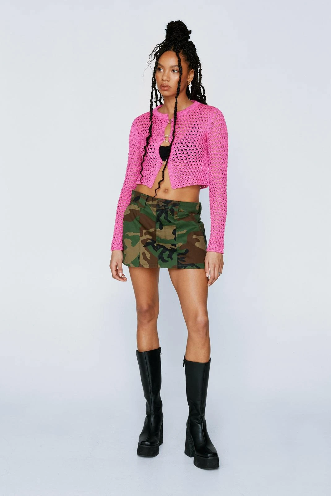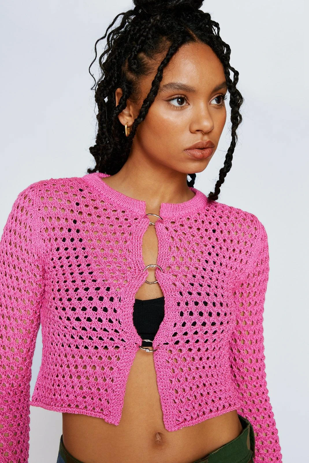 Layer up. Feel cute in our cropped cardigan, made in high quality knit fabric, with unique ring fastenings, a flirty cropped length, and an open knit design. Wear with a crop top and jeans for a cute day out look, or over a mini dress to add something a little different to your evening outfit.