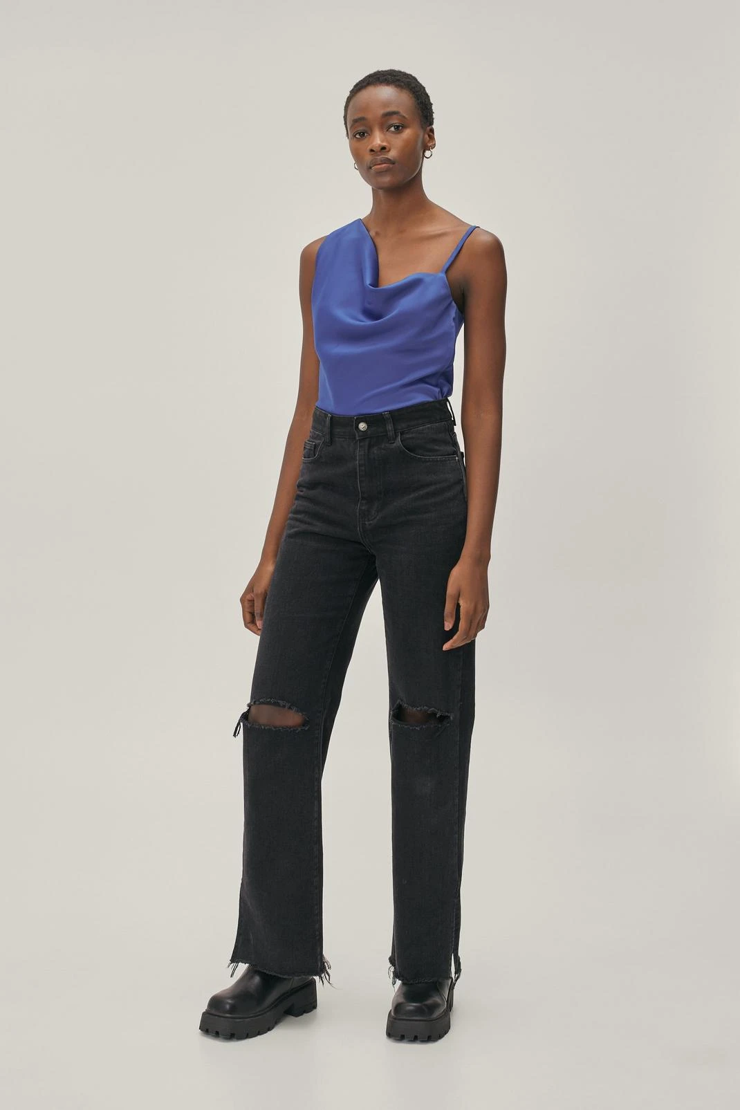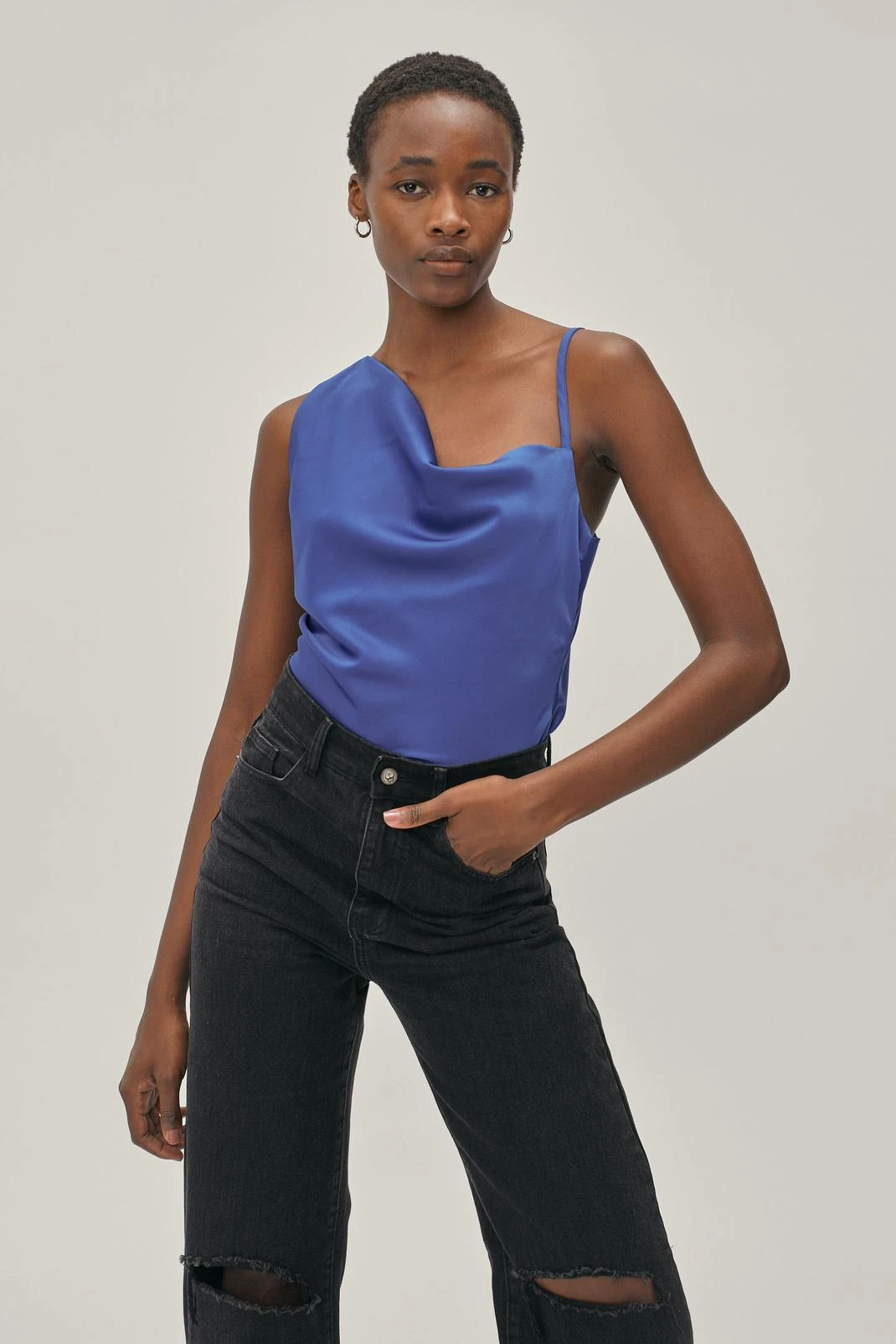 This camisole top comes in satin and features a relaxed, cropped silhouette, asymmetric cowl neckline, cami strap, and curved back. Stand centre stage by pairing with pleated pants and stiletto heels.