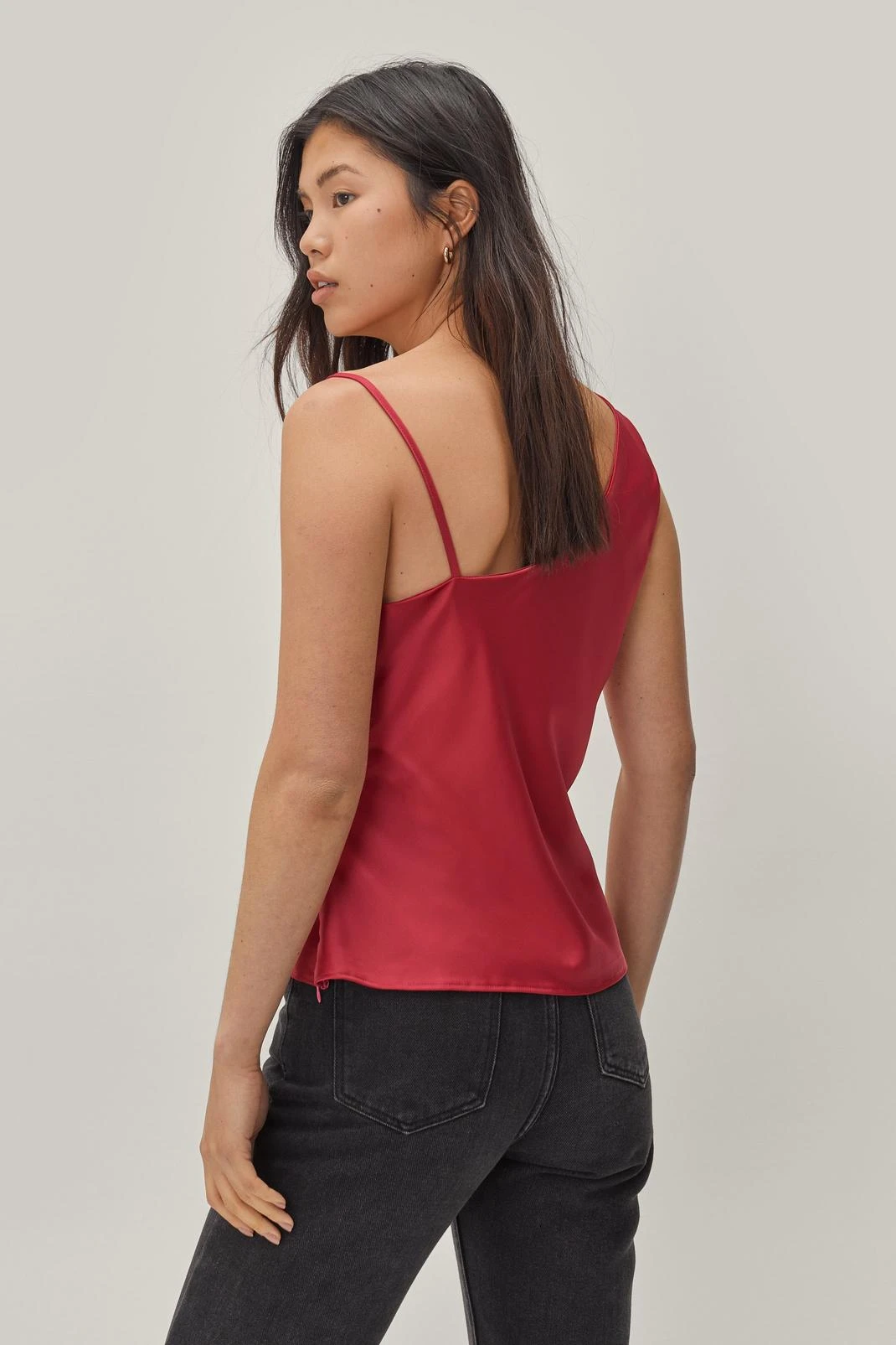 This camisole top comes in satin and features a relaxed, cropped silhouette, asymmetric cowl neckline, cami strap, and curved back. Stand centre stage by pairing with pleated pants and stiletto heels.