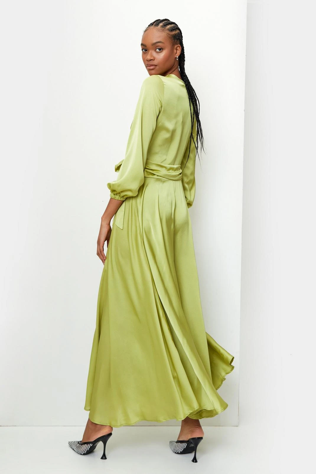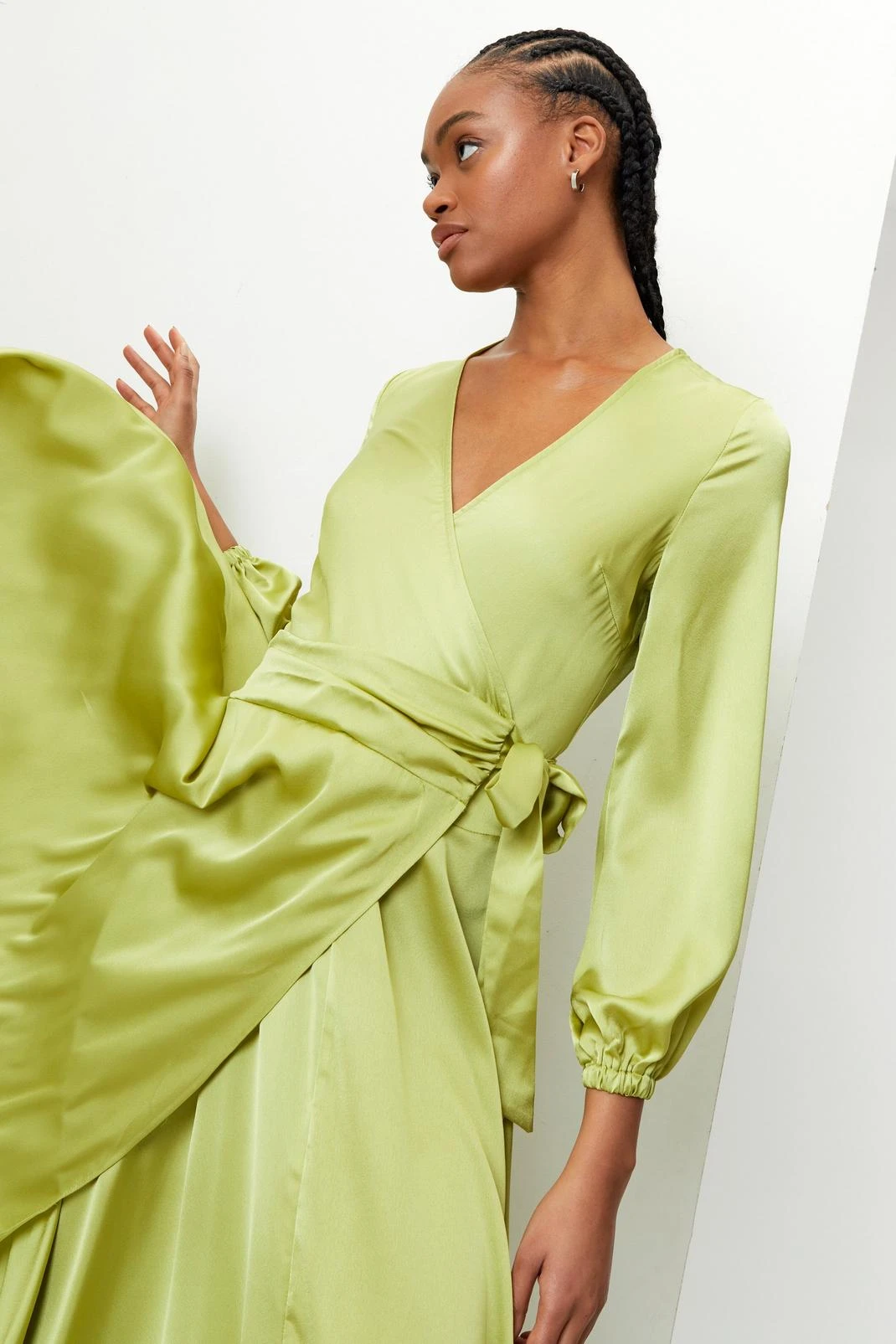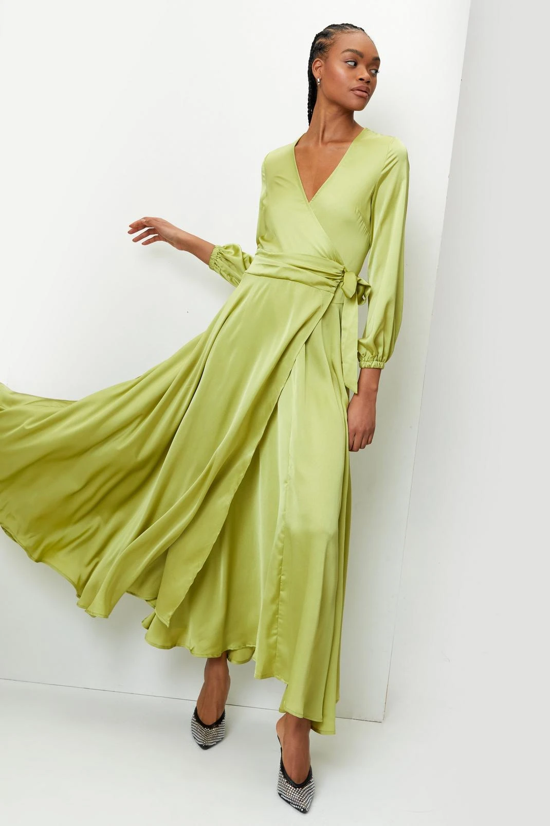 - Satin Balloon Sleeve Wrap Maxi Dress