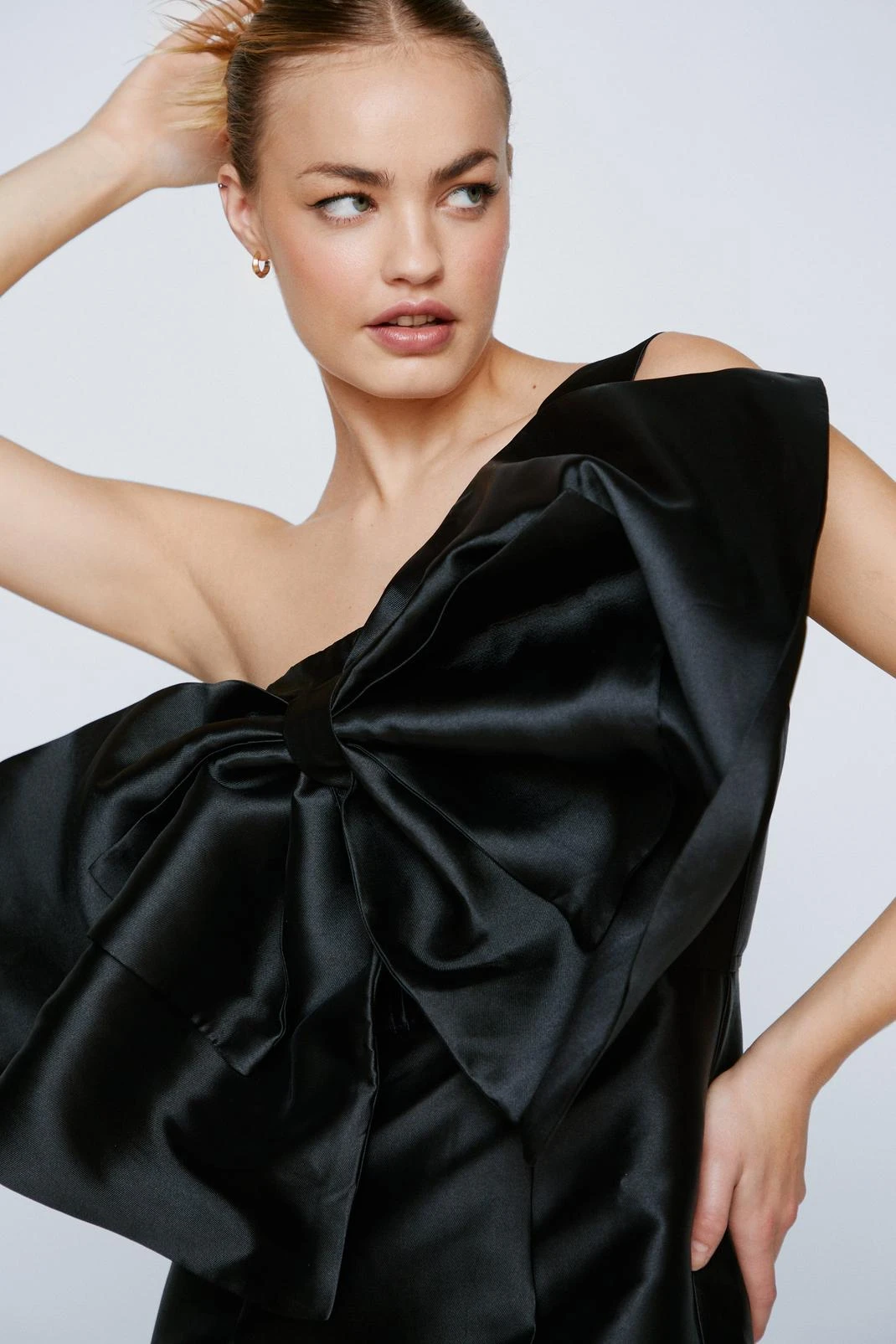 Tied with a bow. Our satin mini cocktail dress features a large bow and one shoulder design for a truly iconic party look.