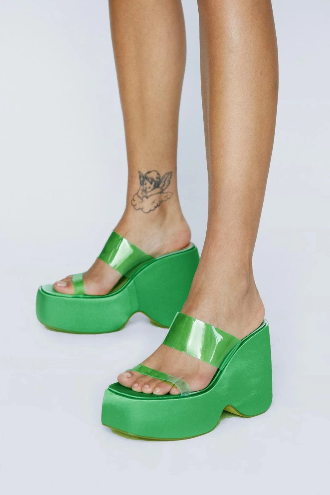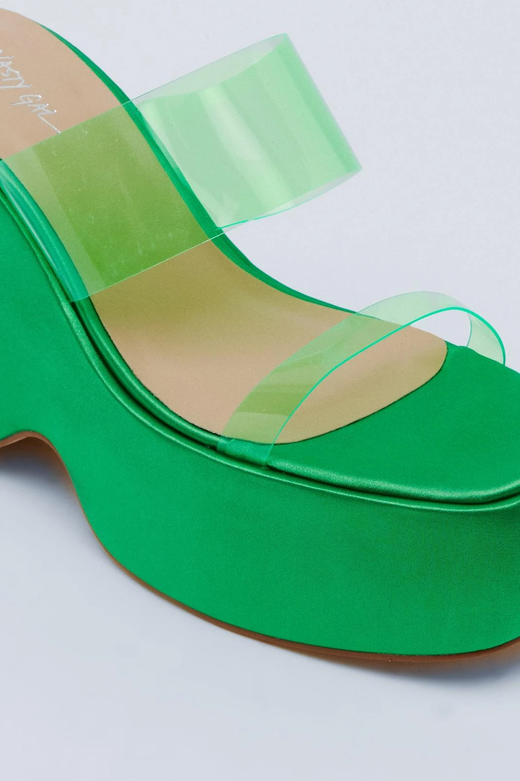 Y2K vibes. Feel femme in our ultra chunky wedge heels, with high quality satin fabric and transparent straps. Pairs well with mini skirts and dresses, or can be used to dress up your jeans for a look that takes you seamlessly from day to night.