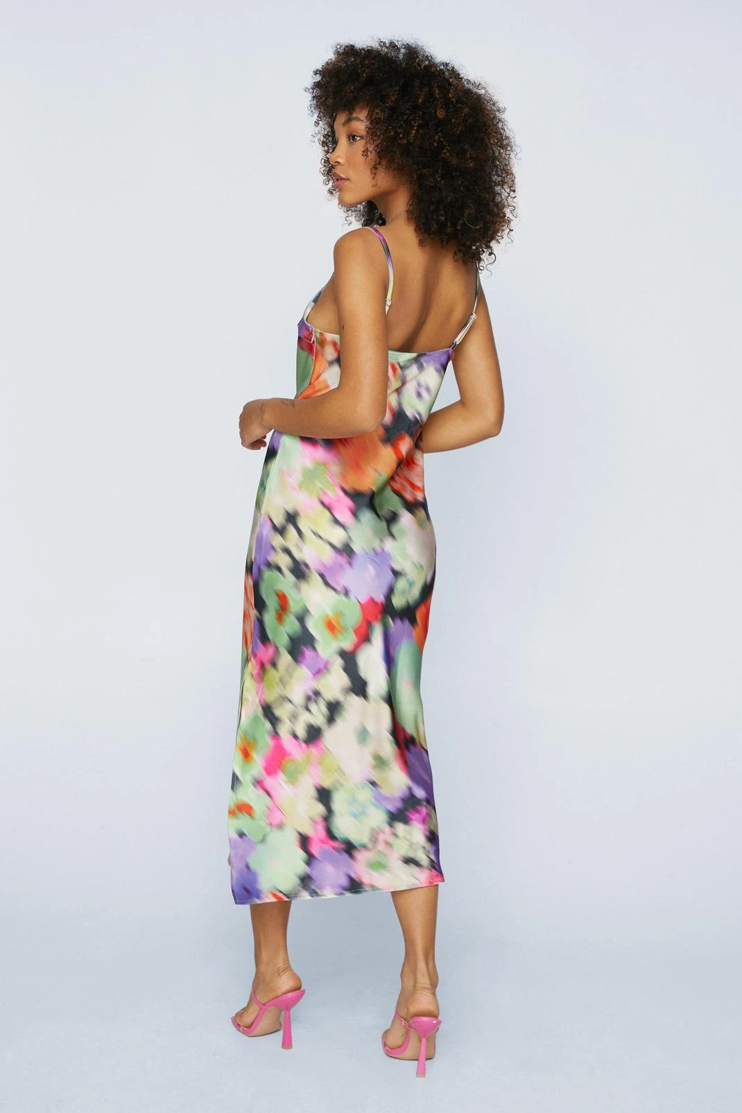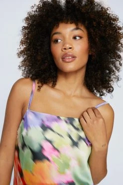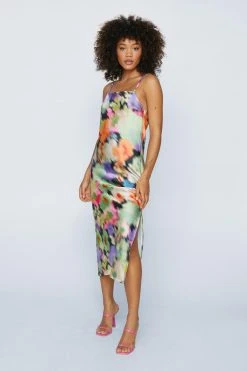 All dressed up. Feel feminine in our slip dress, made in high quality satin fabric, with a blurred floral pattern, a thigh high leg split, and a flattering straight fit. Pairs well with strappy heels for an instant occasion look that you’ll love to keep coming back to, whether you’re looking for a stellar wedding guest look, an alternative prom look, or are simply partying the night away.