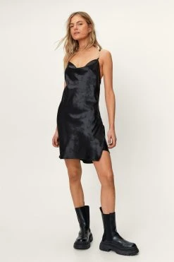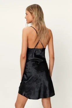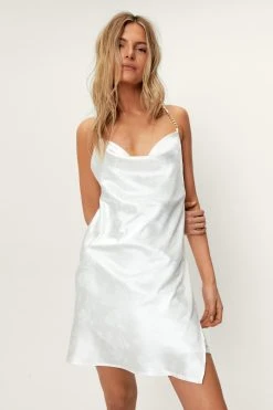 Short and sweet. This sensational slip dress comes in supple satin and features a figure-skimming silhouette, deep cowl neckline, curb chain detailing at adjustable straps with crossover at back, bias cut mini hemline with subtle side split, and floral jacquard design throughout. Dial down for daytime wearing by teaming with leather ankle boots and an oversized denim jean jacket.