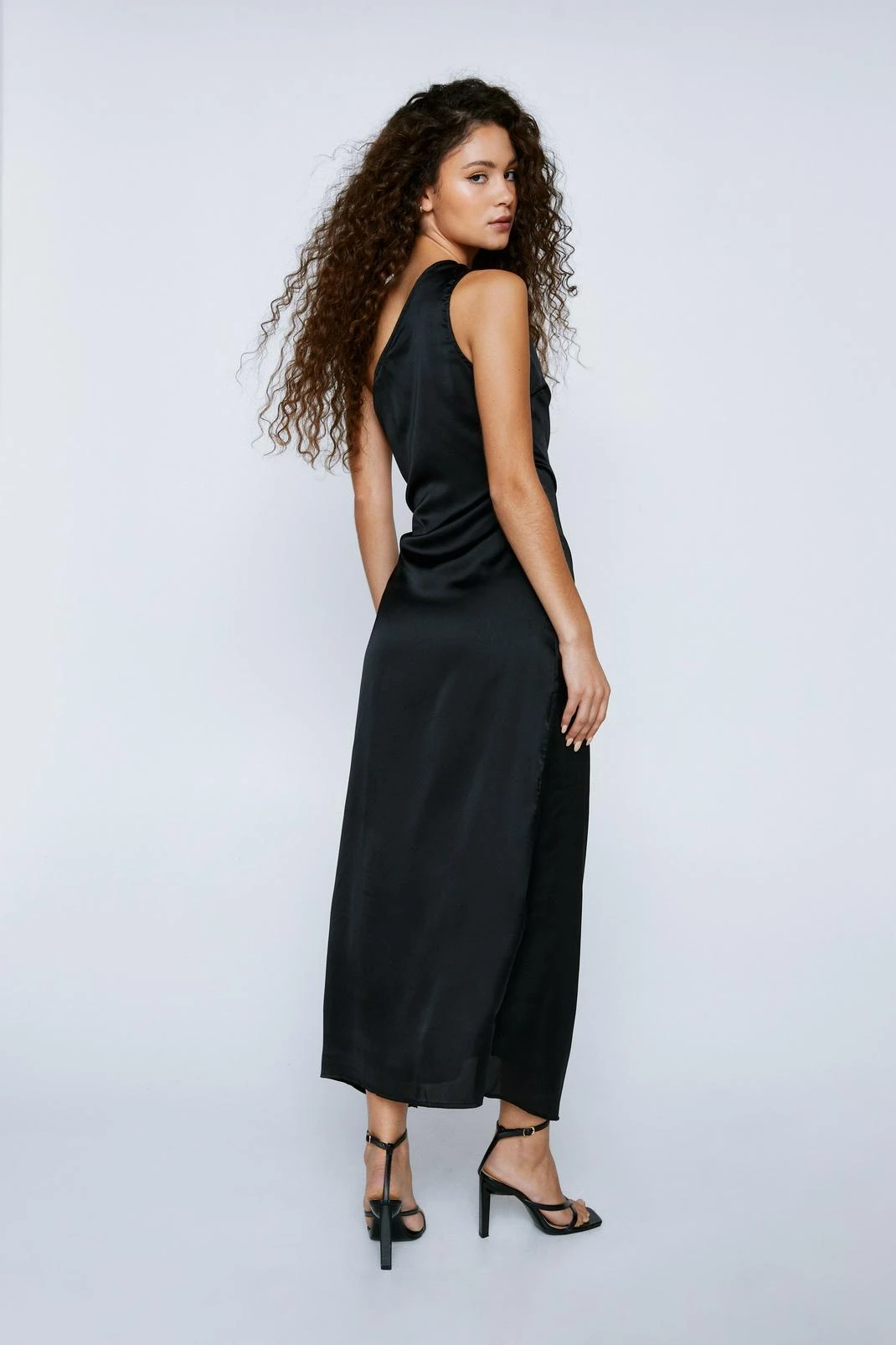 A moment for the dress. Feel fancy when you slip into our maxi dress, made in a high quality satin fabric, with a one shoulder design, cheeky leg split, and lace up insert. Pairs well with strappy heels for a party or occasion look you’ll keep coming back to.