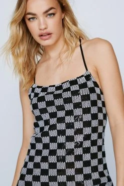Your move. Wear our checkerboard sequin mini dress with boots or strappy heels for a fun occasion look.