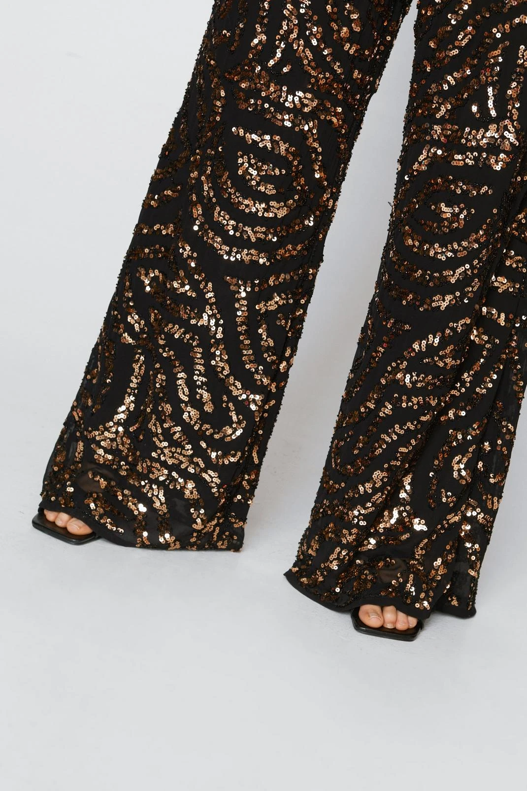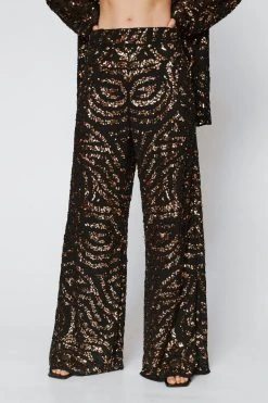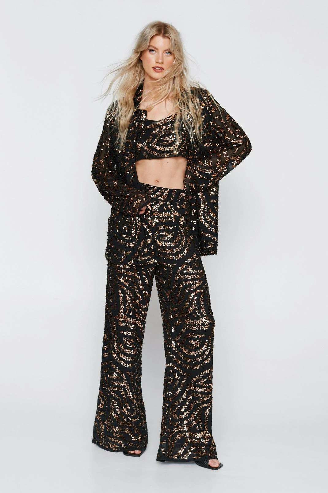Add some sparkle. Feel party ready in our wide leg pants, with a swirling sequin pattern, a flattering high waistline, and a comfortable high waistline. Pair with the matching separates for a failsafe party look that you’ll keep coming back to.
